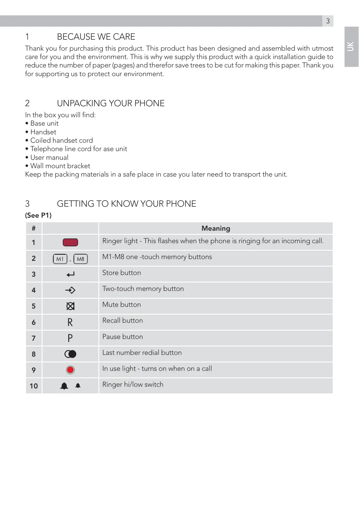 In the box you will find: tBase unit tHandset tCoiled handset cord tTelephone line cord for ase unit tUser manual tWall mount bracket Keep the packing materials in a safe place in case you later need to transport the unit.