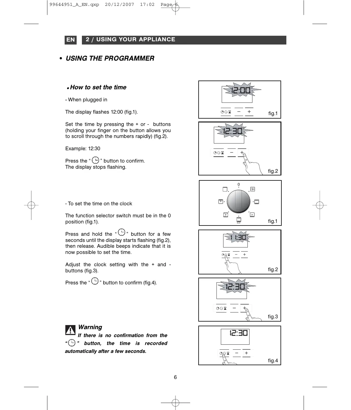 - How to set the time - When plugged in The display flashes 12:00 (fig.1). fig.1 Set the time by pressing the + or - buttons (holding your finger on the button allows you to scroll through the numbers rapidly) (fig.2). Example: 12:30 Press the “ ” button to confirm. The display stops flashing. fig.2 - To set the time on the clock The function selector switch must be in the 0 position (fig.1). fig.1 Press and hold the “ ” button for a few seconds until the display starts flashing (fig.2), then release. Audible beeps indicate that it is now possible to set the time. Adjust the clock setting with the + and buttons (fig.3). Press the “ fig.2 ” button to confirm (fig.4). fig.3 Warning If there is no confirmation from the ” button, the time is recorded automatically after a few seconds. fig.4