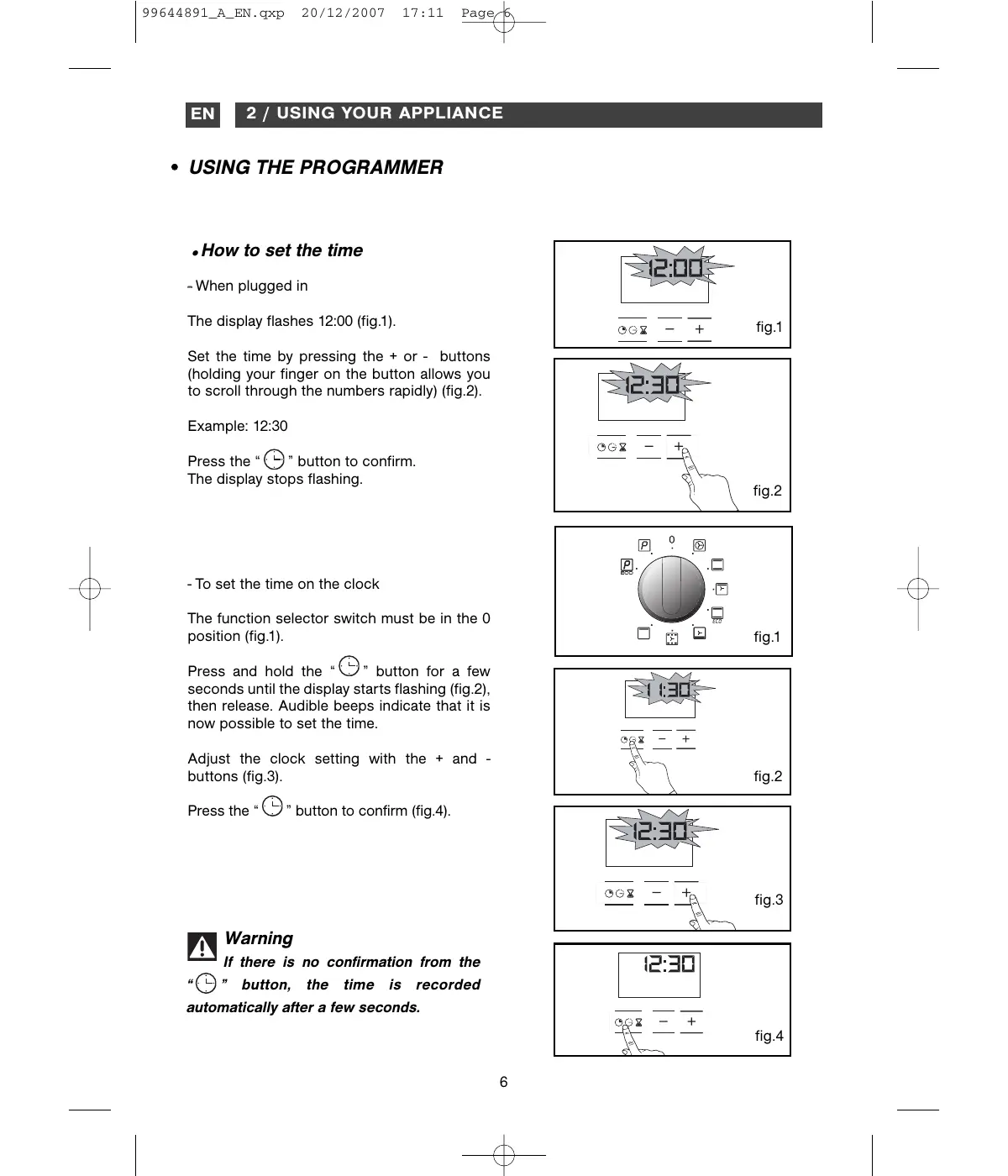 - How to set the time - When plugged in The display flashes 12:00 (fig.1). fig.1 Set the time by pressing the + or - buttons (holding your finger on the button allows you to scroll through the numbers rapidly) (fig.2). Example: 12:30 Press the “ ” button to confirm. The display stops flashing. fig.2 - To set the time on the clock The function selector switch must be in the 0 position (fig.1). fig.1 Press and hold the “ ” button for a few seconds until the display starts flashing (fig.2), then release. Audible beeps indicate that it is now possible to set the time. Adjust the clock setting with the + and buttons (fig.3). Press the “ fig.2 ” button to confirm (fig.4). fig.3 Warning If there is no confirmation from the ” button, the time is recorded automatically after a few seconds. fig.4