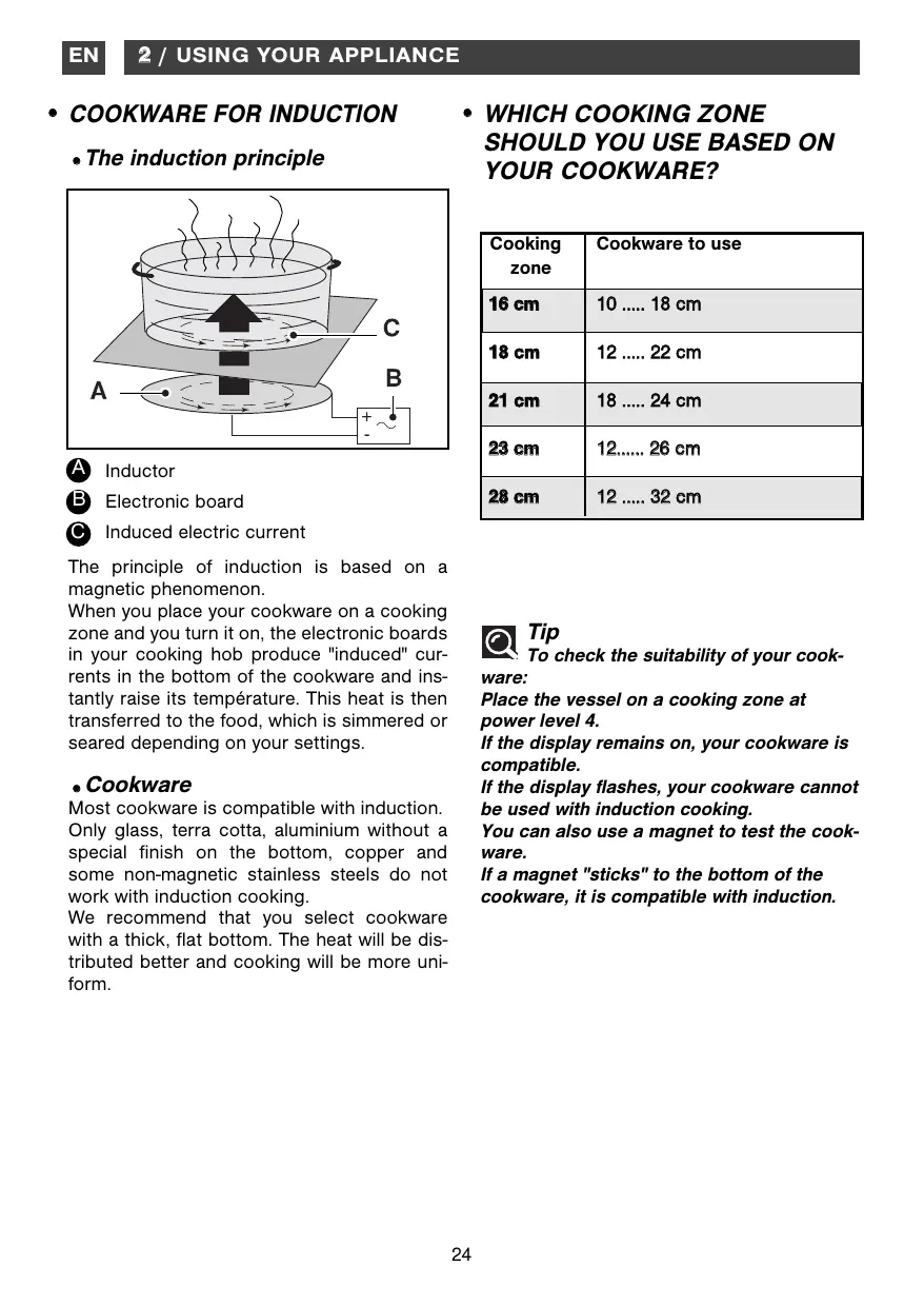 A Inductor B Electronic board C Induced electric current The principle of induction is based on a magnetic phenomenon. When you place your cookware on a cooking zone and you turn it on, the electronic boards in your cooking hob produce "induced" currents in the bottom of the cookware and instantly raise its température. This heat is then transferred to the food, which is simmered or seared depending on your settings. Tip To check the suitability of your cookware: Place the vessel on a cooking zone at power level 4. If the display remains on, your cookware is compatible. If the display flashes, your cookware cannot be used with induction cooking. You can also use a magnet to test the cookware. If a magnet "sticks" to the bottom of the cookware, it is compatible with induction.