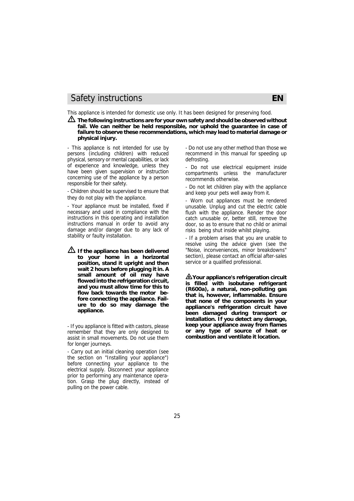 This appliance is intended for domestic use only. It has been designed for preserving food. The following instructions are for your own safety and should be observed without fail. We can neither be held responsible, nor uphold the guarantee in case of failure to observe these recommendations, which may lead to material damage or physical injury. - Do not use any other method than those we recommend in this manual for speeding up defrosting. - Do not use electrical equipment inside compartments unless the manufacturer recommends otherwise. - Do not let children play with the appliance and keep your pets well away from it. - Worn out appliances must be rendered unusable. Unplug and cut the electric cable flush with the appliance. Render the door catch unusable or, better still, remove the door, so as to ensure that no child or animal risks being shut inside whilst playing. - If a problem arises that you are unable to resolve using the advice given (see the "Noise, inconveniences, minor breakdowns" section), please contact an official after-sales service or a qualified professional. - This appliance is not intended for use by persons (including children) with reduced physical, sensory or mental capabilities, or lack of experience and knowledge, unless they have been given supervision or instruction concerning use of the appliance by a person responsible for their safety. - Children should be supervised to ensure that they do not play with the appliance. - Your appliance must be installed, fixed if necessary and used in compliance with the instructions in this operating and installation instructions manual in order to avoid any damage and/or danger due to any lack of stability or faulty installation. If the appliance has been delivered to your home in a horizontal position, stand it upright and then wait 2 hours before plugging it in. A small amount of oil may have flowed into the refrigeration circuit, and you must allow time for this to flow back towards the motor before connecting the appliance. Failure to do so may damage the appliance. Your appliance's refrigeration circuit is filled with isobutane refrigerant (R600a), a natural, non-polluting gas that is, however, inflammable. Ensure that none of the components in your appliance's refrigeration circuit have been damaged during transport or installation. If you detect any damage, keep your appliance away from flames or any type of source of heat or combustion and ventilate it location. - If you appliance is fitted with castors, please remember that they are only designed to assist in small movements. Do not use them for longer journeys. - Carry out an initial cleaning operation (see the section on "Installing your appliance") before connecting your appliance to the electrical supply. Disconnect your appliance prior to performing any maintenance operation. Grasp the plug directly, instead of pulling on the power cable.