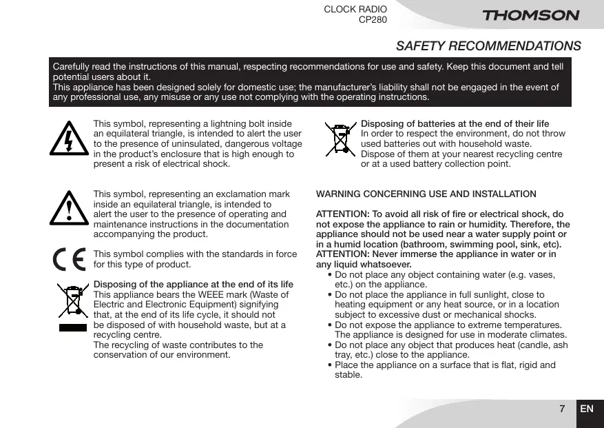 In order to respect the environment, do not throw used batteries out with household waste. Dispose of them at your nearest recycling centre or at a used battery collection point. WARNING CONCERNING USE AND INSTALLATION ATTENTION: To avoid all risk of fire or electrical shock, do not expose the appliance to rain or humidity. Therefore, the appliance should not be used near a water supply point or in a humid location (bathroom, swimming pool, sink, etc). ATTENTION: Never immerse the appliance in water or in any liquid whatsoever. • Do not place any object containing water (e.g. vases, etc.) on the appliance. • Do not place the appliance in full sunlight, close to heating equipment or any heat source, or in a location subject to excessive dust or mechanical shocks. • Do not expose the appliance to extreme temperatures. The appliance is designed for use in moderate climates. • Do not place any object that produces heat (candle, ash tray, etc.) close to the appliance. • Place the appliance on a surface that is flat, rigid and stable.