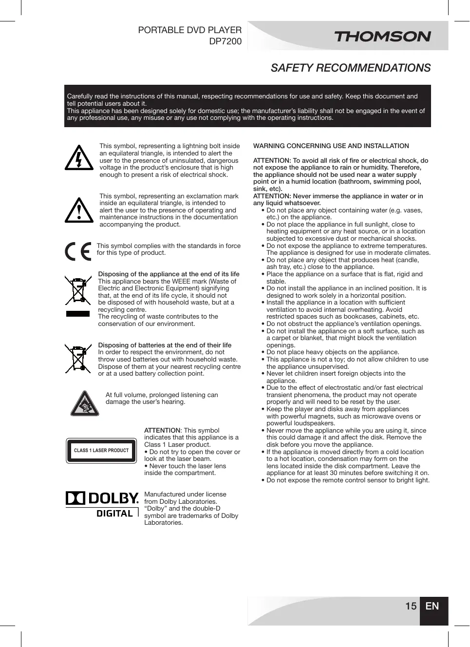 SAFETY RECOMMENDATIONS Carefully read the instructions of this manual, respecting recommendations for use and safety. Keep this document and tell potential users about it. This appliance has been designed solely for domestic use; the manufacturer’s liability shall not be engaged in the event of any professional use, any misuse or any use not complying with the operating instructions. This symbol, representing a lightning bolt inside an equilateral triangle, is intended to alert the user to the presence of uninsulated, dangerous voltage in the product’s enclosure that is high enough to present a risk of electrical shock. This symbol, representing an exclamation mark inside an equilateral triangle, is intended to alert the user to the presence of operating and maintenance instructions in the documentation accompanying the product. This symbol complies with the standards in force for this type of product. Disposing of the appliance at the end of its life This appliance bears the WEEE mark (Waste of Electric and Electronic Equipment) signifying that, at the end of its life cycle, it should not be disposed of with household waste, but at a recycling centre. The recycling of waste contributes to the conservation of our environment. Disposing of batteries at the end of their life In order to respect the environment, do not throw used batteries out with household waste. Dispose of them at your nearest recycling centre or at a used battery collection point. At full volume, prolonged listening can damage the user’s hearing.