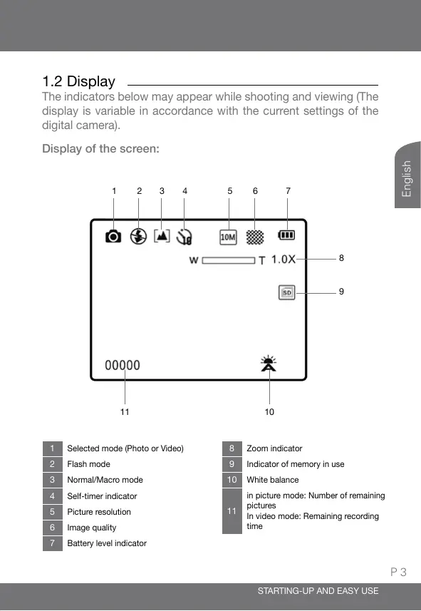 Advanced use Description The white balance is automatically adapted to the ambient lighting. The white balance is adapted to sunbeams. Use it for photographing under a cloudy sky. Use it for a fluorescent lighting (neon lights). Use it for an incandescent lighting (filament lamps). It allows monitoring the light sensitivity of the digital camera. Greater is the ISO value, more sensitive is the light therefore the camera’s ability is better for photographing in lighting low conditions; take a note that the noise of the image (grain) increases proportionally at the ISO value. English MENU As you adjust the exposure correction, the general brightness of the picture can be adjusted in such a way that the pictures are brighter or darker. Select the positive values (+) to increase the exposure and select the negative values (-) to decrease the exposure. The digital camera is equipped with a self-timer running from 2, 5 to 10 seconds for the auto portraits or to avoid the blurring effect coming from the camera shake.