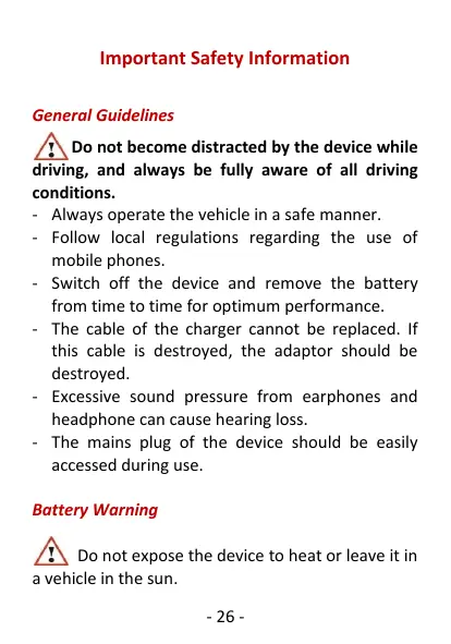Important Safety Information General Guidelines Do not become distracted by the device while driving, and always be fully aware of all driving conditions. - Always operate the vehicle in a safe manner. - Follow local regulations regarding the use of mobile phones. - Switch off the device and remove the battery from time to time for optimum performance. - The cable of the charger cannot be replaced. If this cable is destroyed, the adaptor should be destroyed. - Excessive sound pressure from earphones and headphone can cause hearing loss. - The mains plug of the device should be easily accessed during use. Battery Warning Do not expose the device to heat or leave it in a vehicle in the sun.