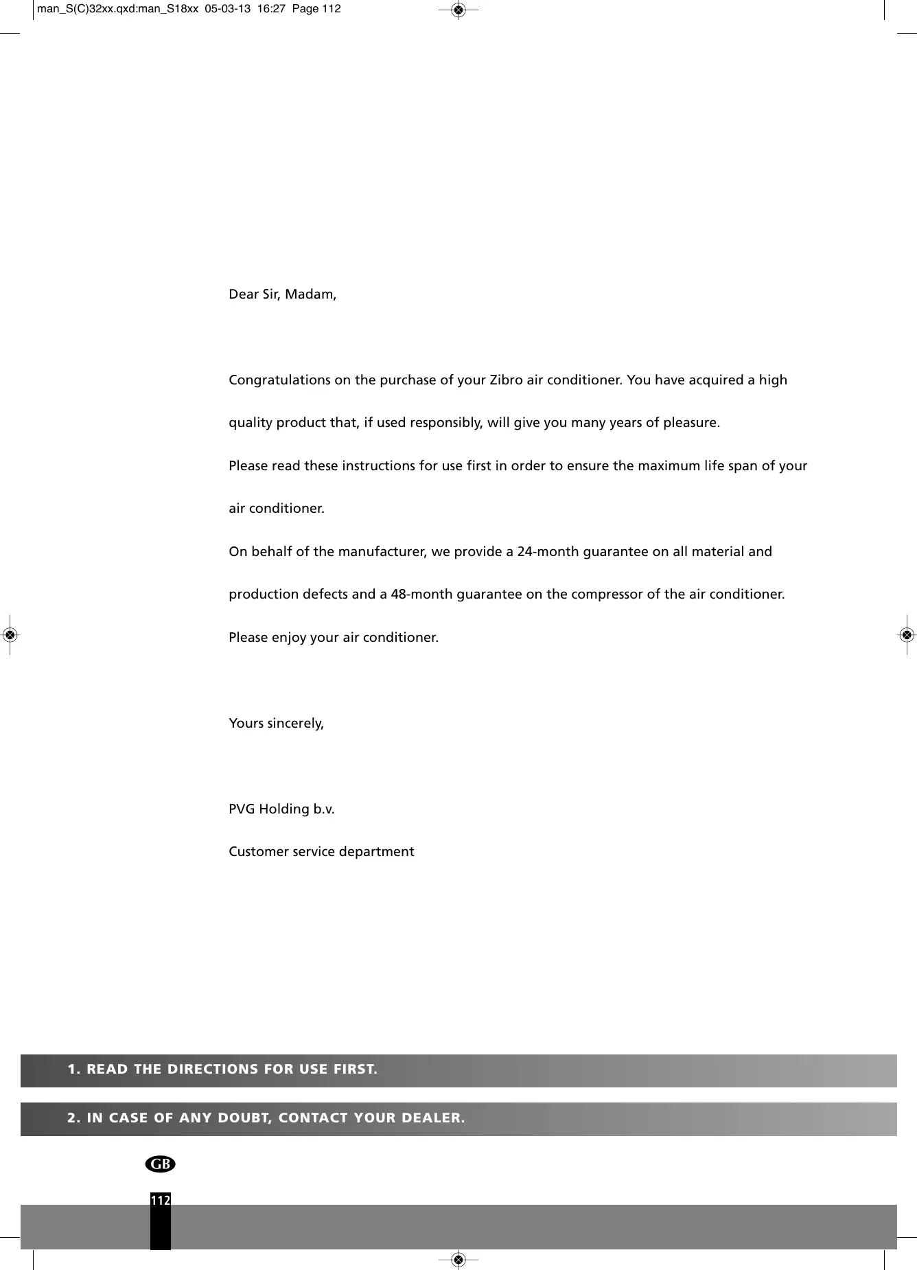 Please read these instructions for use first in order to ensure the maximum life span of your air conditioner. On behalf of the manufacturer, we provide a 24-month guarantee on all material and production defects and a 48-month guarantee on the compressor of the air conditioner. Please enjoy your air conditioner.