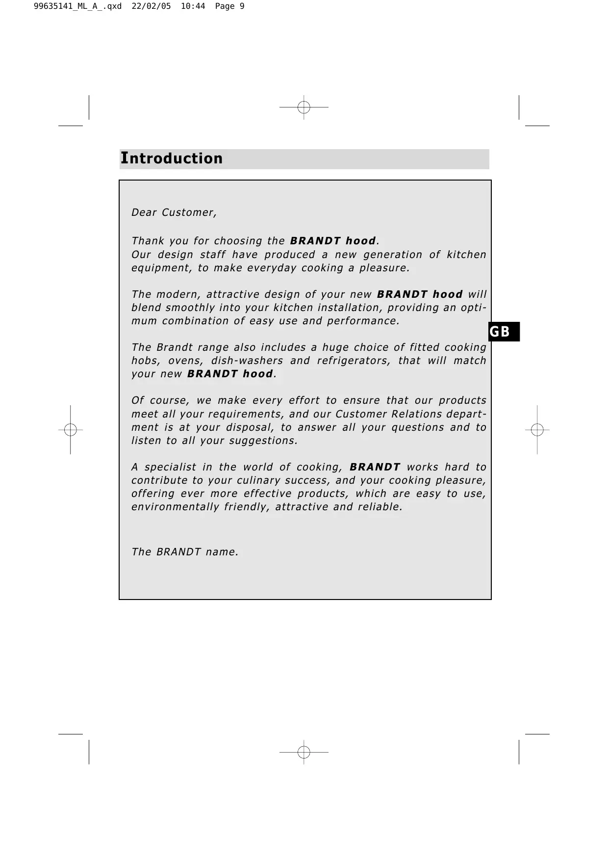 retirez le film de protection. recyclage I ntroduction Dear Customer, Thank you for choosing the BRANDT hood. Our design staff have produced a new generation of kitchen equipment, to make everyday cooking a pleasure. The modern, attractive design of your new BRANDT hood will blend smoothly into your kitchen installation, providing an optimum combination of easy use and performance. The Brandt range also includes a huge choice of fitted cooking hobs, ovens, dish-washers and refrigerators, that will match your new BRANDT hood. Of course, we make every effort to ensure that our products meet all your requirements, and our Customer Relations department is at your disposal, to answer all your questions and to listen to all your suggestions. A specialist in the world of cooking, BRANDT works hard to contribute to your culinary success, and your cooking pleasure, offering ever more effective products, which are easy to use, environmentally friendly, attractive and reliable. S afety instructions - You should never "flambé" dishes under the hood or operate gas rings under the hood without cooking utensils being placed on them (the flames sucked up into the hood can damage the appliance). - When frying food under the appliance, a careful watch must be kept on this at all times. - Repairs must only be carried out by an approved specialist. - You should regularly clean the filter cartridge. - The hood should never be used over a combustible fuel burning stove (wood, coal, etc). These hoods have been designed for non-commercial use in private homes. With a view to constantly improving our products, we reserve the right to modify their technical, functional or aesthetic characteristics, making any changes to their features considered necessary or desirable in view of technical progress. These hoods are designed exclusively for cooking foodstuffs and drinks. These products do not contain any asbestos based components. Throughout this manual, indicates safety recommendations, indicates advice to help you make the best use of your oven 99635141_ML_A_.qxd 22/02/05 10:44 Page 11 T he controls on your hood Fig.1 3-speed model