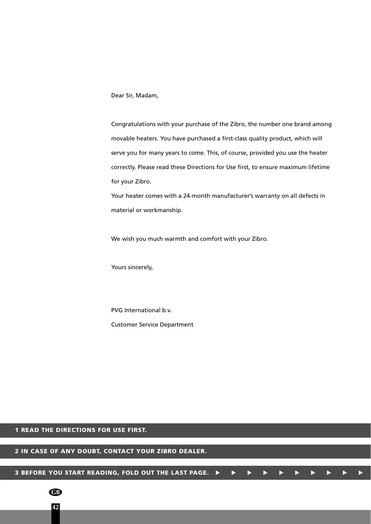 Dear Sir, Madam, Congratulations with your purchase of the Zibro, the number one brand among movable heaters. You have purchased a first-class quality product, which will serve you for many years to come. This, of course, provided you use the heater correctly. Please read these Directions for Use first, to ensure maximum lifetime for your Zibro. Your heater comes with a 24-month manufacturer’s warranty on all defects in material or workmanship. We wish you much warmth and comfort with your Zibro. Yours sincerely, PVG International b.v. Customer Service Department 1 READ THE DIRECTIONS FOR USE FIRST. 2 IN CASE OF ANY DOUBT, CONTACT YOUR ZIBRO DEALER. Below you will find the main steps to be taken for using your Zibro. For more details, please refer to the
