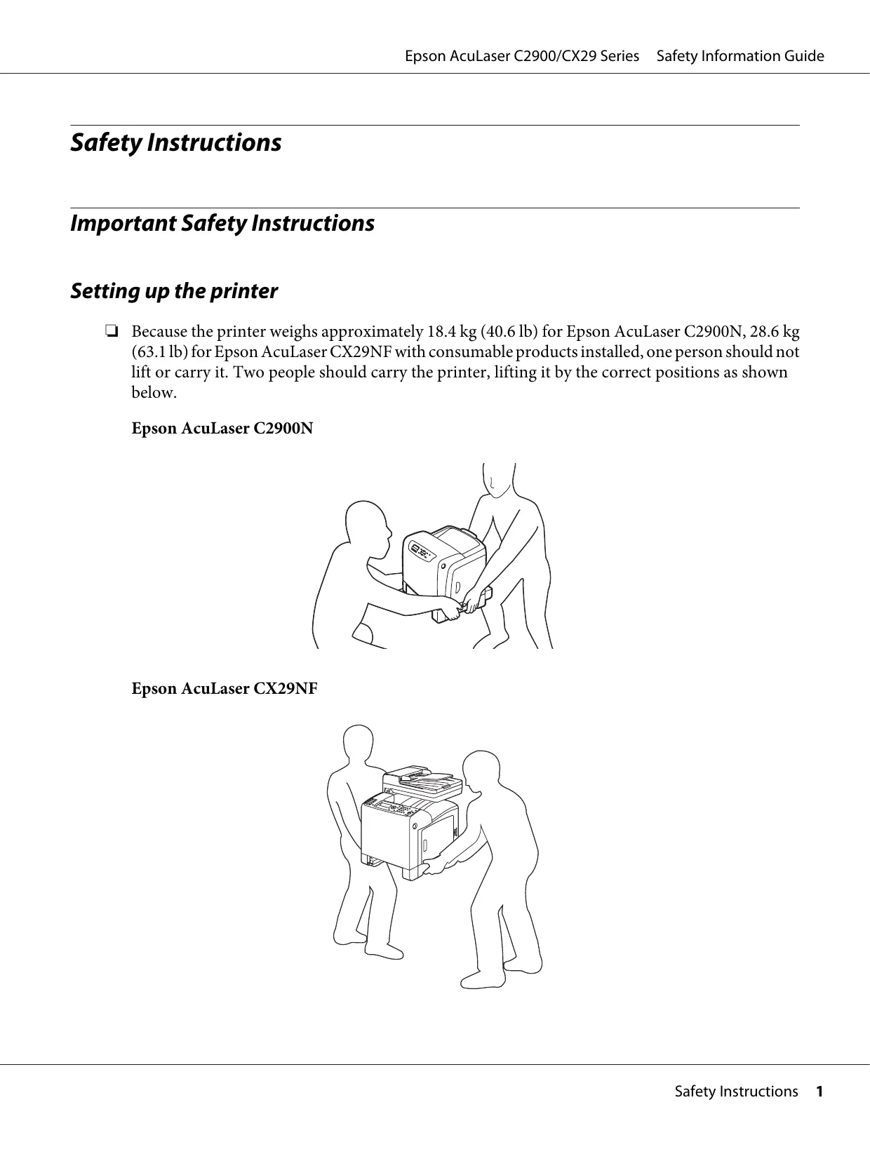 Important Safety Instructions Setting up the printer ❏ Because the printer weighs approximately 18.4 kg (40.6 lb) for Epson AcuLaser C2900N, 28.6 kg (63.1 lb) for Epson AcuLaser CX29NF with consumable products installed, one person should not lift or carry it. Two people should carry the printer, lifting it by the correct positions as shown below.