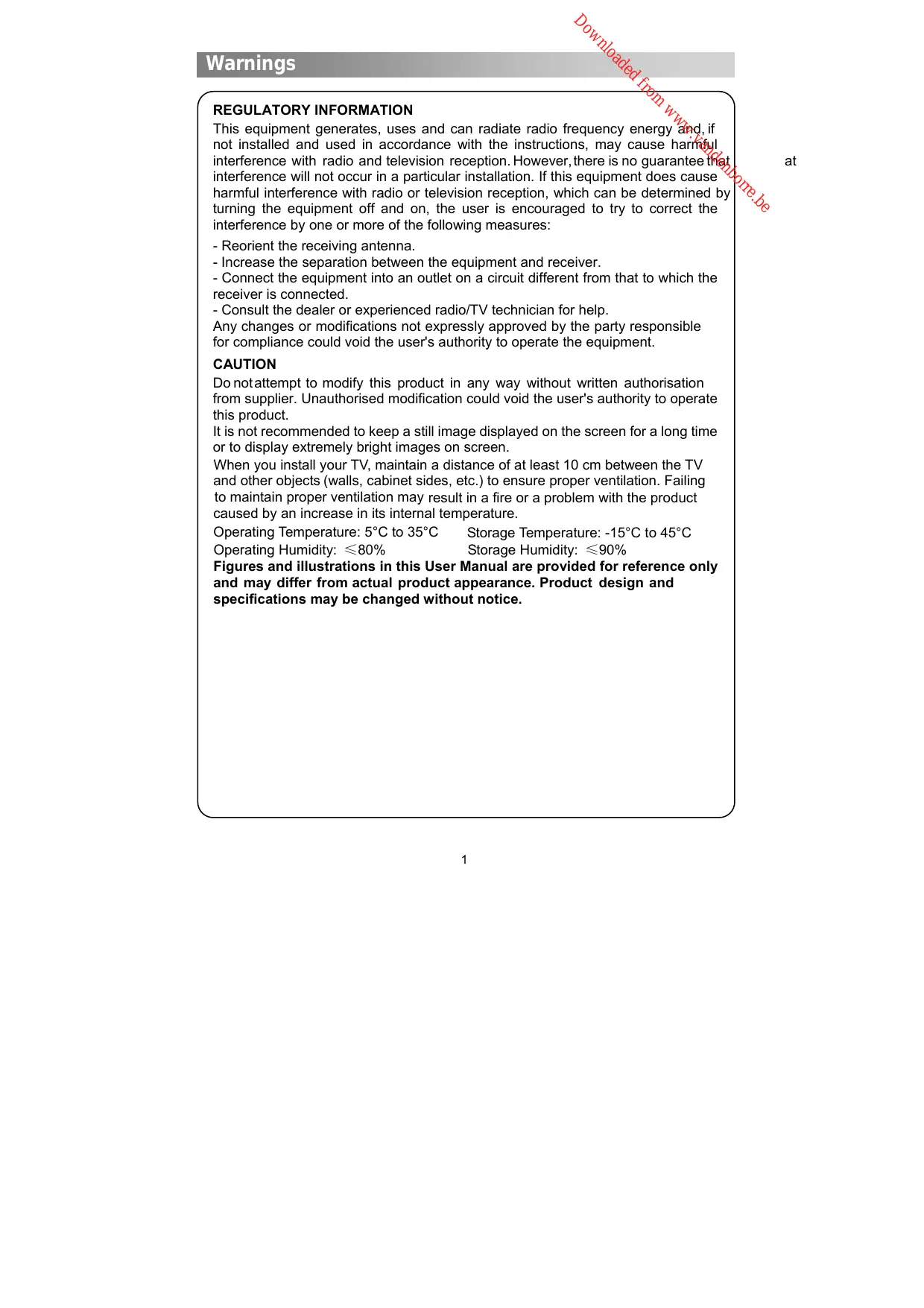 CAUTION Do not attempt to modify this product in any way without written authorisation from supplier. Unauthorised modification could void the user's authority to operate this product. It is not recommended to keep a still image displayed on the screen for a long time or to display extremely bright images on screen. When you install your TV, maintain a distance of at least 10 cm between the TV and other objects (walls, cabinet sides, etc.) to ensure proper ventilation. Failing to maintain proper ventilation may result in a fire or a problem with the product caused by an increase in its internal temperature. Operating Temperature: 5°C to 35°C Storage Temperature: -15°C to 45°C Operating Humidity: ≤80% Storage Humidity: ≤90% Figures and illustrations in this User Manual are provided for reference only and may differ from actual product appearance. Product design and specifications may be changed without notice.