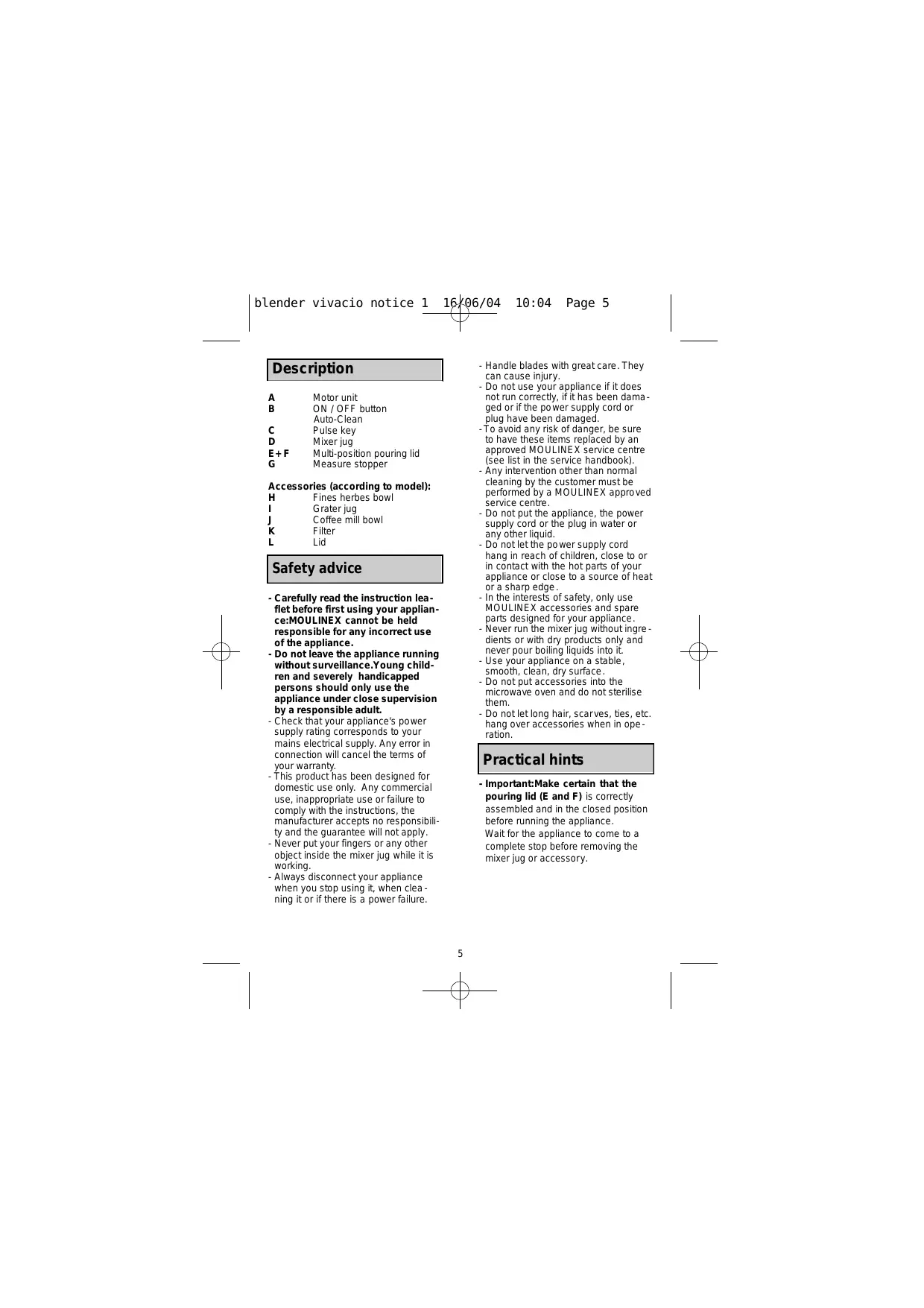 10:04 Motor unit ON / OFF button Auto-Clean Pulse key Mixer jug Multi-position pouring lid Measure stopper Accessories (according to model): Fines herbes bowl Grater jug Coffee mill bowl Filter Lid Safety advice - Carefully read the instruction leaflet before first using your appliance:MOULINEX cannot be held responsible for any incorrect use of the appliance. - Do not leave the appliance running without surveillance.Young children and severely handicapped persons should only use the appliance under close supervision by a responsible adult. - Check that your appliance's power supply rating corresponds to your mains electrical supply. Any error in connection will cancel the terms of your warranty. - This product has been designed for domestic use only. Any commercial use, inappropriate use or failure to comply with the instructions, the manufacturer accepts no responsibility and the guarantee will not apply. - Never put your fingers or any other object inside the mixer jug while it is working. - Always disconnect your appliance when you stop using it, when clea ning it or if there is a power failure. Practical hints - Important:Make certain that the pouring lid (E and F) is correctly assembled and in the closed position before running the appliance. Wait for the appliance to come to a complete stop before removing the mixer jug or accessory.