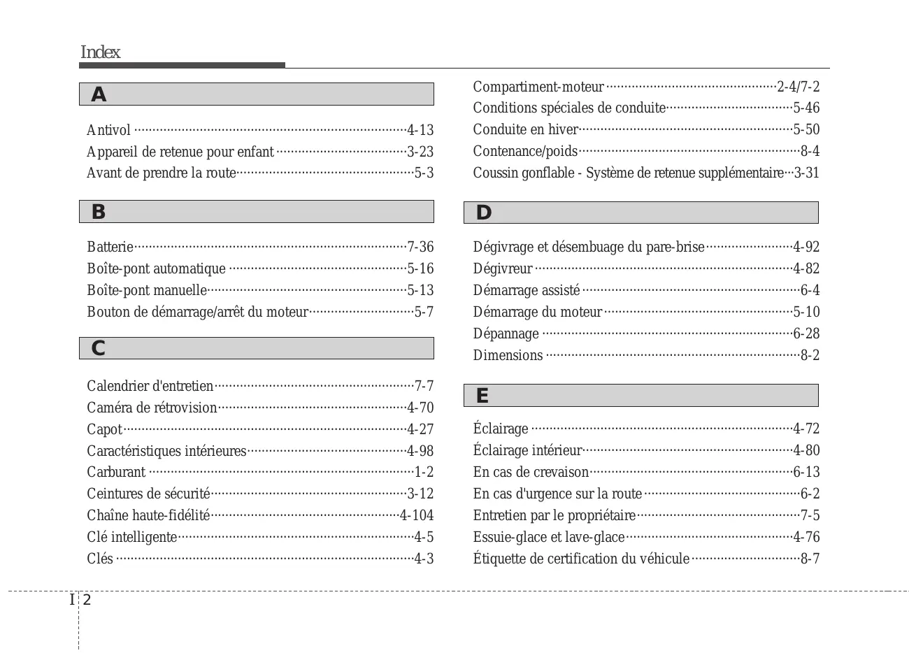 Batterie···········································································7-36 Boîte-pont automatique ·················································5-16 Boîte-pont manuelle·······················································5-13 Bouton de démarrage/arrêt du moteur·····························5-7 Dégivrage et désembuage du pare-brise························4-92 Dégivreur ·······································································4-82 Démarrage assisté ····························································6-4 Démarrage du moteur ····················································5-10 Dépannage ·····································································6-28 Dimensions ······································································8-2