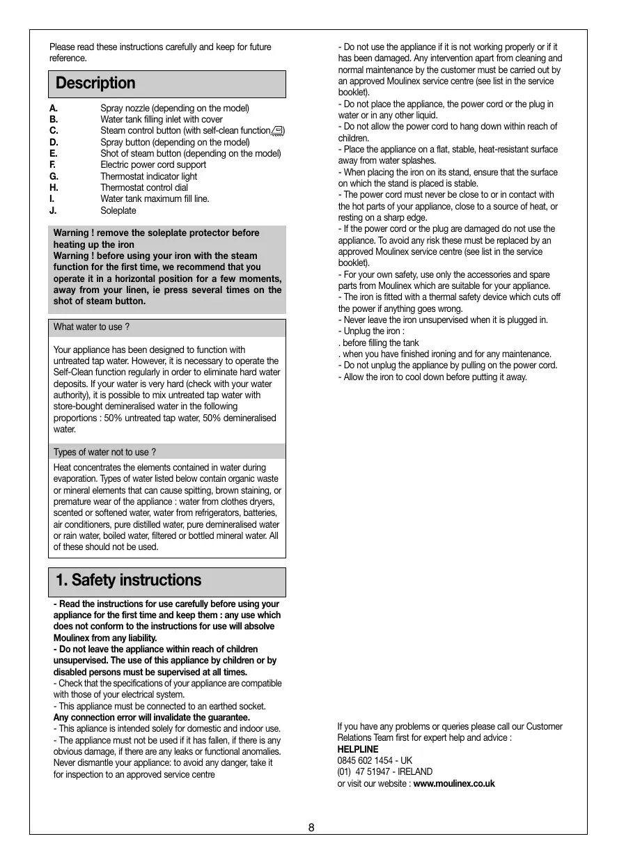 - Do not place the appliance, the power cord or the plug in water or in any other liquid. - Do not allow the power cord to hang down within reach of children. - Place the appliance on a flat, stable, heat-resistant surface away from water splashes. - When placing the iron on its stand, ensure that the surface on which the stand is placed is stable. - The power cord must never be close to or in contact with the hot parts of your appliance, close to a source of heat, or resting on a sharp edge. - If the power cord or the plug are damaged do not use the appliance. To avoid any risk these must be replaced by an approved Moulinex service centre (see list in the service booklet). - For your own safety, use only the accessories and spare parts from Moulinex which are suitable for your appliance. - The iron is fitted with a thermal safety device which cuts off the power if anything goes wrong. - Never leave the iron unsupervised when it is plugged in. - Unplug the iron : . before filling the tank . when you have finished ironing and for any maintenance. - Do not unplug the appliance by pulling on the power cord. - Allow the iron to cool down before putting it away.
