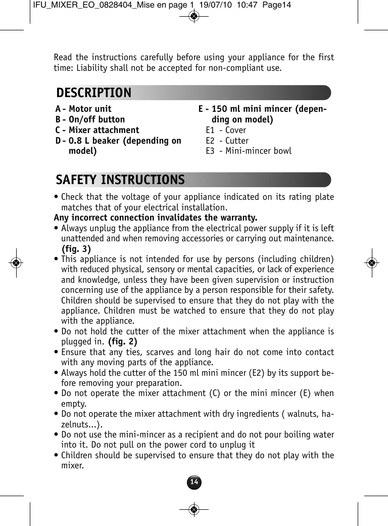 Read the instructions carefully before using your appliance for the first time: Liability shall not be accepted for non-compliant use. DESCRIPTION A - Motor unit B - On/off button C - Mixer attachment D - 0.8 L beaker (depending on model) E - 150 ml mini mincer (depending on model) E1 - Cover E2 - Cutter E3 - Mini-mincer bowl SAFETY INSTRUCTIONS