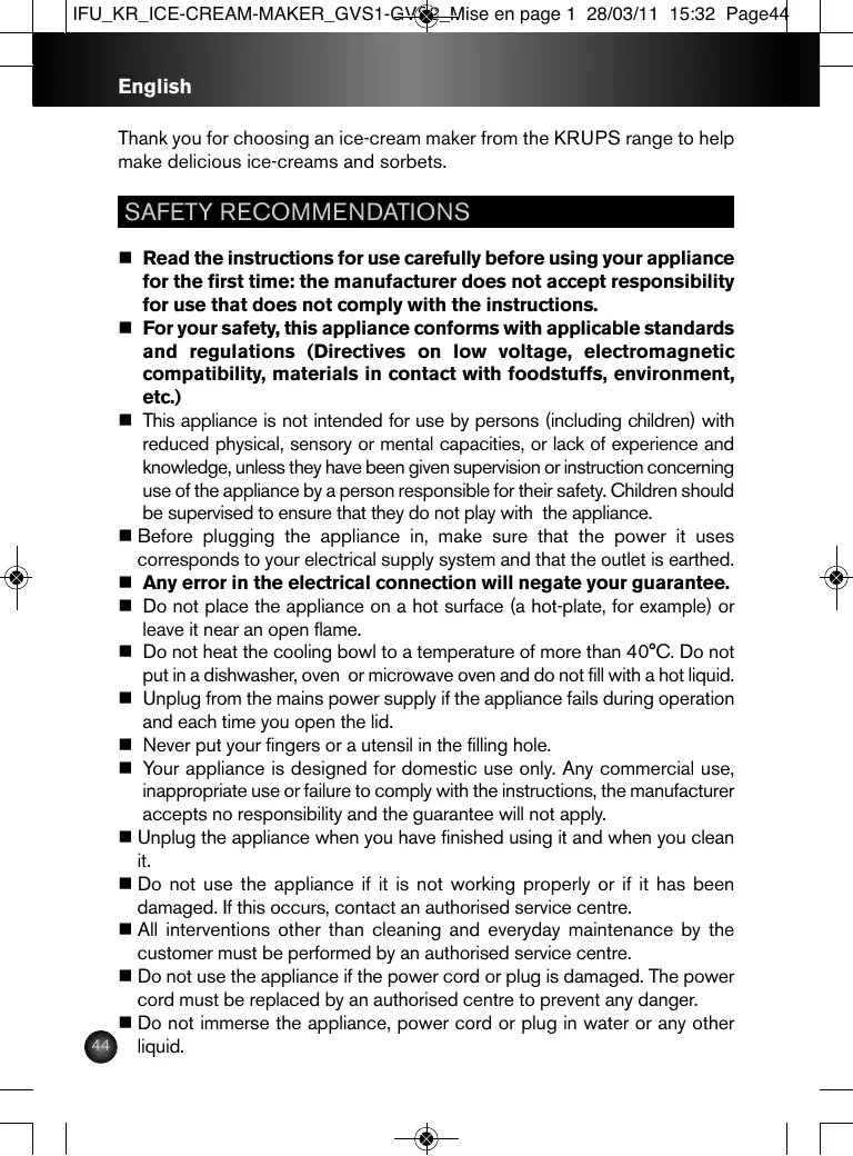 Thank you for choosing an ice-cream maker from the KRUPS range to help make delicious ice-creams and sorbets.