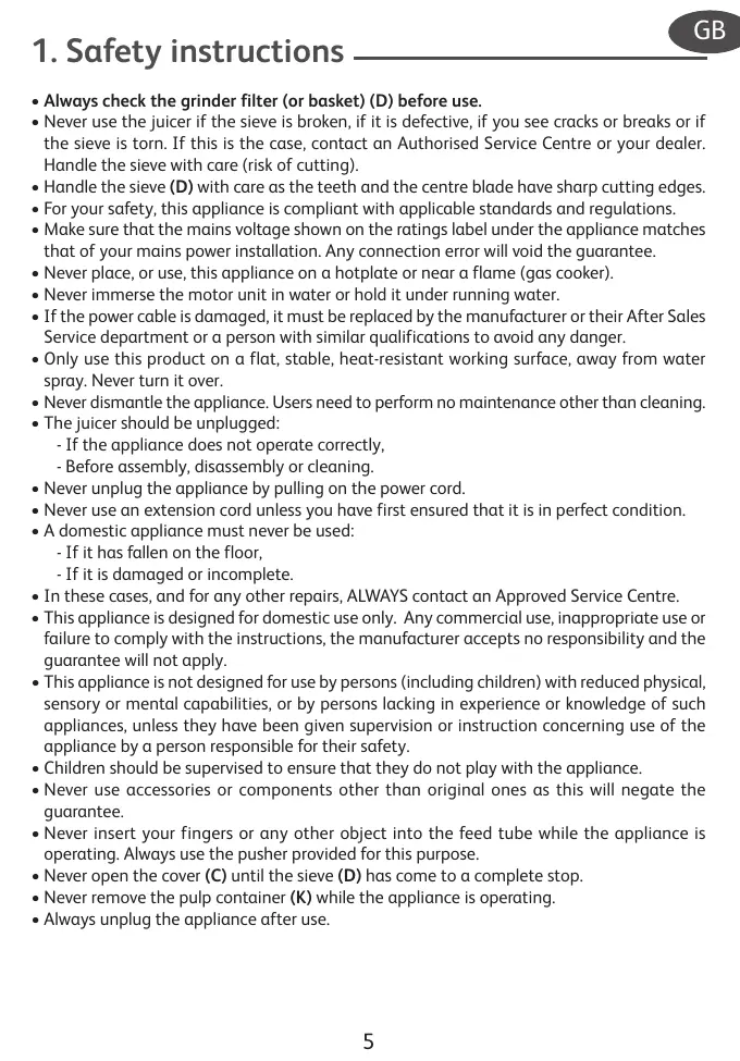 • Never use the juicer if the sieve is broken, if it is defective, if you see cracks or breaks or if the sieve is torn. If this is the case, contact an Authorised Service Centre or your dealer. Handle the sieve with care (risk of cutting). • Handle the sieve (D) with care as the teeth and the centre blade have sharp cutting edges. • For your safety, this appliance is compliant with applicable standards and regulations. • Make sure that the mains voltage shown on the ratings label under the appliance matches that of your mains power installation. Any connection error will void the guarantee. • Never place, or use, this appliance on a hotplate or near a flame (gas cooker). • Never immerse the motor unit in water or hold it under running water. • If the power cable is damaged, it must be replaced by the manufacturer or their After Sales Service department or a person with similar qualifications to avoid any danger. • Only use this product on a flat, stable, heat-resistant working surface, away from water spray. Never turn it over. • Never dismantle the appliance. Users need to perform no maintenance other than cleaning. • The juicer should be unplugged: - If the appliance does not operate correctly, - Before assembly, disassembly or cleaning. • Never unplug the appliance by pulling on the power cord. • Never use an extension cord unless you have first ensured that it is in perfect condition. • A domestic appliance must never be used: - If it has fallen on the floor, - If it is damaged or incomplete. • In these cases, and for any other repairs, ALWAYS contact an Approved Service Centre. • This appliance is designed for domestic use only. Any commercial use, inappropriate use or failure to comply with the instructions, the manufacturer accepts no responsibility and the guarantee will not apply. • This appliance is not designed for use by persons (including children) with reduced physical, sensory or mental capabilities, or by persons lacking in experience or knowledge of such appliances, unless they have been given supervision or instruction concerning use of the appliance by a person responsible for their safety. • Children should be supervised to ensure that they do not play with the appliance. • Never use accessories or components other than original ones as this will negate the guarantee. • Never insert your fingers or any other object into the feed tube while the appliance is operating. Always use the pusher provided for this purpose. • Never open the cover (C) until the sieve (D) has come to a complete stop. • Never remove the pulp container (K) while the appliance is operating. • Always unplug the appliance after use.