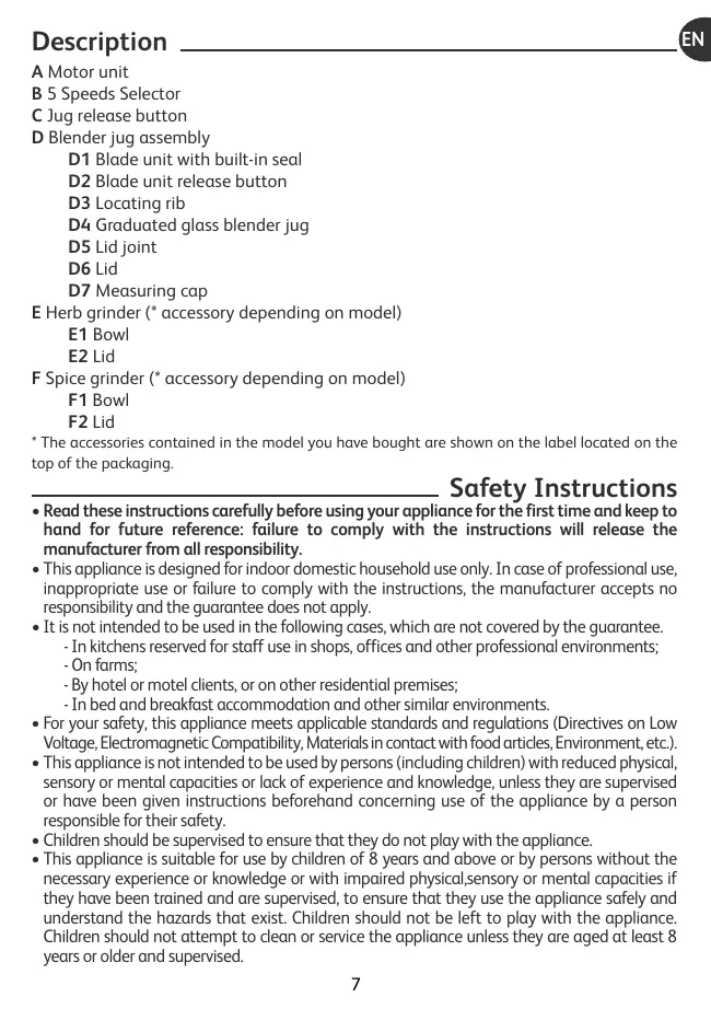 Description A Motor unit B 5 Speeds Selector C Jug release button D Blender jug assembly D1 Blade unit with built-in seal D2 Blade unit release button D3 Locating rib D4 Graduated glass blender jug D5 Lid joint D6 Lid D7 Measuring cap E Herb grinder (* accessory depending on model) E1 Bowl E2 Lid F Spice grinder (* accessory depending on model) F1 Bowl F2 Lid * The accessories contained in the model you have bought are shown on the label located on the top of the packaging.
