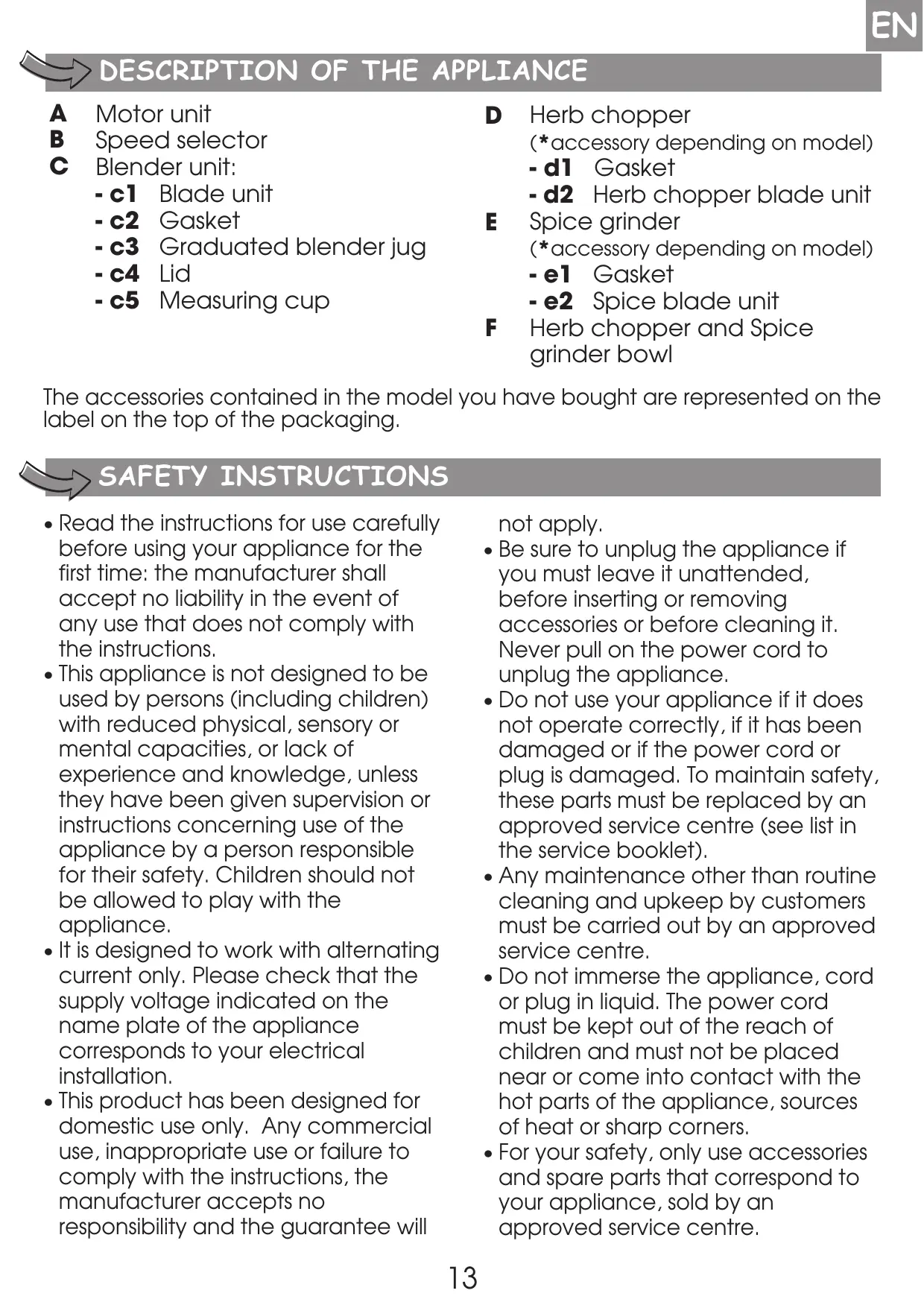 Herb chopper (*accessory depending on model) (*accessory depending on model) - e1 Gasket - e2 Spice blade unit Herb chopper and Spice grinder bowl The accessories contained in the model you have bought are represented on the label on the top of the packaging. SAFETY INSTRUCTIONS