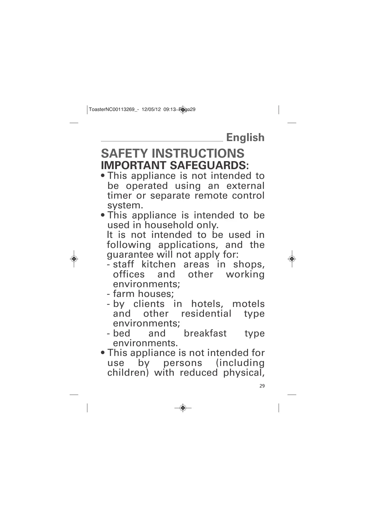• This appliance is intended to be used in household only. It is not intended to be used in following applications, and the guarantee will not apply for: - staff kitchen areas in shops, offices and other working environments; - farm houses; - by clients in hotels, motels and other residential type environments; - bed and breakfast type environments. • This appliance is not intended for use by persons (including children) with reduced physical, 29 17