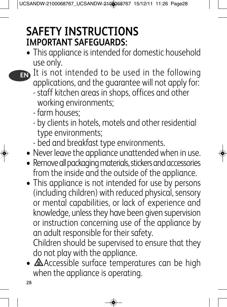 SAFETY INSTRUCTIONS IMPORTANT SAFEGUARDS: • This appliance is intended for domestic household use only. EN It is not intended to be used in the following applications, and the guarantee will not apply for: - staff kitchen areas in shops, offices and other working environments; - farm houses; - by clients in hotels, motels and other residential type environments; - bed and breakfast type environments. • Never leave the appliance unattended when in use. • Remove all packaging materials, stickers and accessories from the inside and the outside of the appliance. • This appliance is not intended for use by persons (including children) with reduced physical, sensory or mental capabilities, or lack of experience and knowledge, unless they have been given supervision or instruction concerning use of the appliance by an adult responsible for their safety. Children should be supervised to ensure that they do not play with the appliance. • Accessible surface temperatures can be high when the appliance is operating. 28