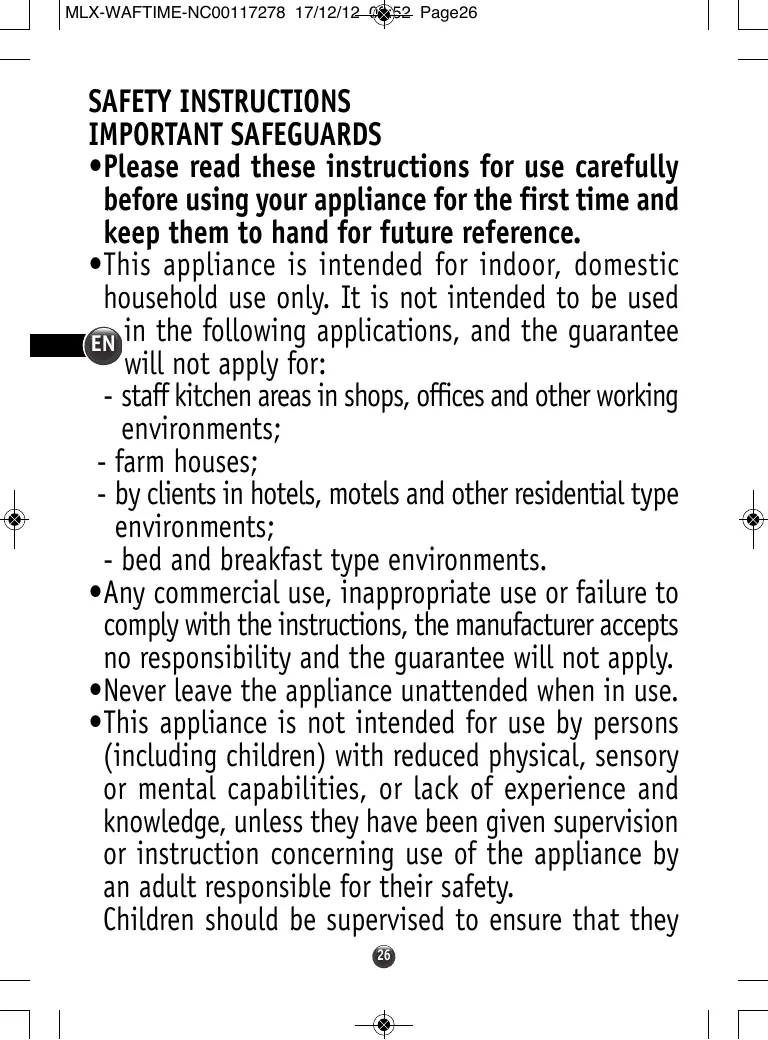 SAFETY INSTRUCTIONS IMPORTANT SAFEGUARDS •Please read these instructions for use carefully before using your appliance for the first time and keep them to hand for future reference. •This appliance is intended for indoor, domestic household use only. It is not intended to be used EN in the following applications, and the guarantee will not apply for: - staff kitchen areas in shops, offices and other working environments; - farm houses; - by clients in hotels, motels and other residential type environments; - bed and breakfast type environments. •Any commercial use, inappropriate use or failure to comply with the instructions, the manufacturer accepts no responsibility and the guarantee will not apply. •Never leave the appliance unattended when in use. •This appliance is not intended for use by persons (including children) with reduced physical, sensory or mental capabilities, or lack of experience and knowledge, unless they have been given supervision or instruction concerning use of the appliance by an adult responsible for their safety. Children should be supervised to ensure that they 26