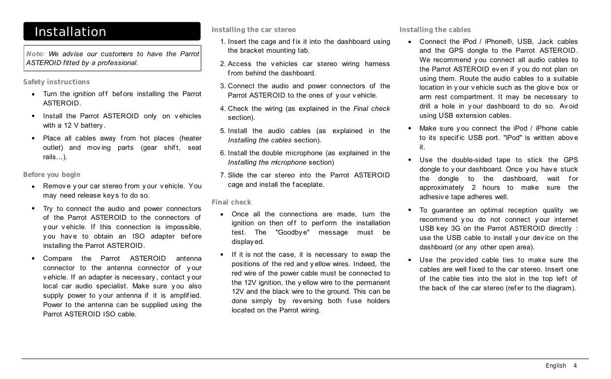 Installation Note: We advise our customers to have the Parrot ASTEROID fitted by a professional. Safety instructions Turn the ignition of f bef ore installing the Parrot ASTEROID. Install the Parrot ASTEROID only on v ehicles with a 12 V battery . Place all cables away f rom hot places (heater outlet) and mov ing parts (gear shif t, seat rails...). Before you begin Remov e y our car stereo f rom y our v ehicle. Y ou may need release key s to do so. Try to connect the audio and power connectors of the Parrot ASTEROID to the connectors of y our v ehicle. If this connection is impossible, y ou hav e to obtain an ISO adapter bef ore installing the Parrot ASTEROID. Compare the Parrot ASTEROID antenna connector to the antenna connector of y our v ehicle. If an adapter is necessary , contact y our local car audio specialist. Make sure y ou also supply power to y our antenna if it is amplif ied. Power to the antenna can be supplied using the Parrot ASTEROID ISO cable. Installing the car stereo