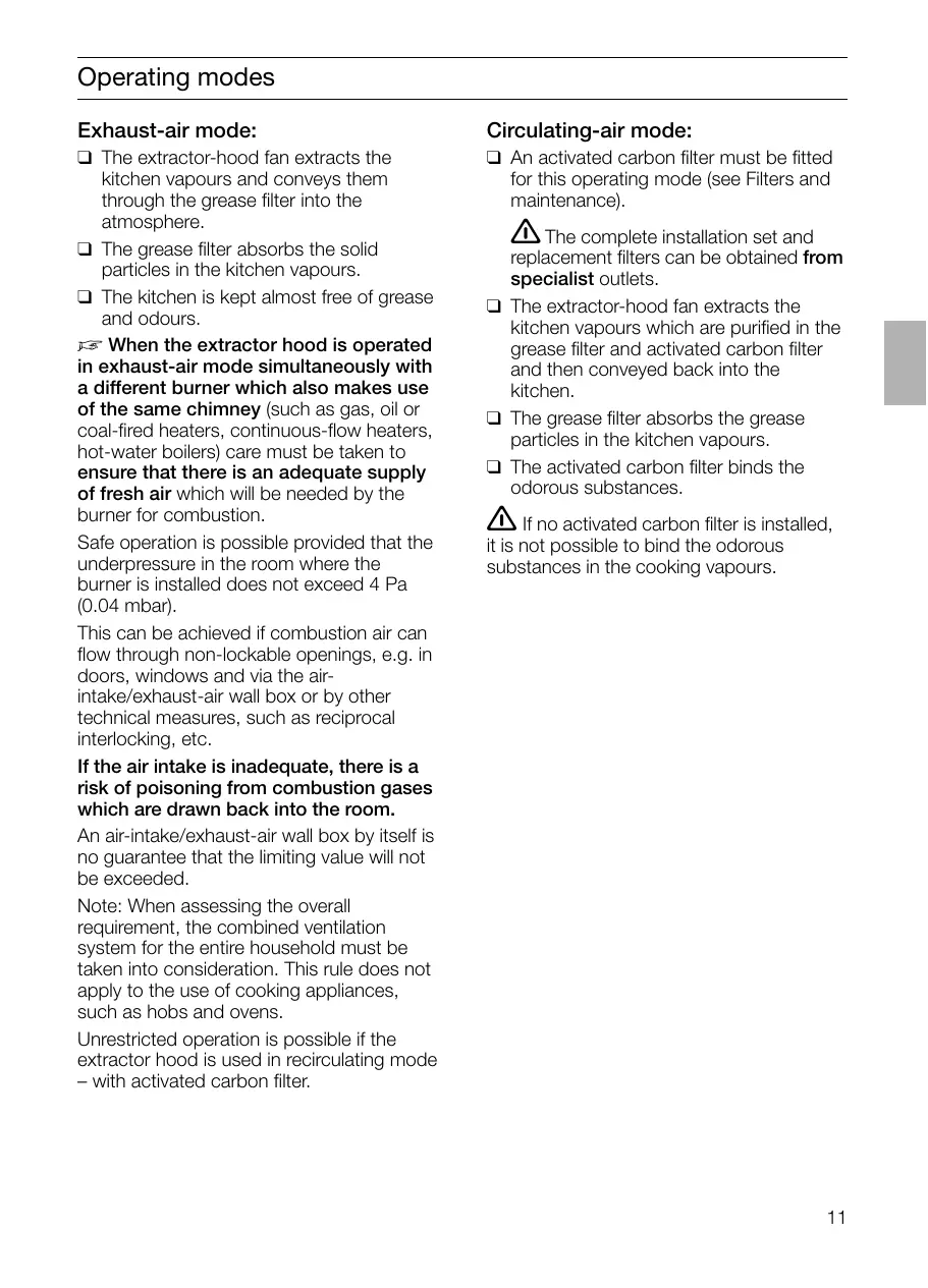 sayfa 99– 106 Betriebsarten Abluftbetrieb: Umluftbetrieb: Operating modes Exhaust-air mode: Circulating-air mode: ❑ The extractor-hood fan extracts the kitchen vapours and conveys them through the grease filter into the atmosphere. ❑ The grease filter absorbs the solid particles in the kitchen vapours. ❑ The kitchen is kept almost free of grease and odours. D When the extractor hood is operated in exhaust-air mode simultaneously with a different burner which also makes use of the same chimney (such as gas, oil or coal-fired heaters, continuous-flow heaters, hot-water boilers) care must be taken to ensure that there is an adequate supply of fresh air which will be needed by the burner for combustion. Safe operation is possible provided that the underpressure in the room where the burner is installed does not exceed 4 Pa (0.04 mbar). This can be achieved if combustion air can flow through non-lockable openings, e.g. in doors, windows and via the airintake/exhaust-air wall box or by other technical measures, such as reciprocal interlocking, etc. If the air intake is inadequate, there is a risk of poisoning from combustion gases which are drawn back into the room. An air-intake/exhaust-air wall box by itself is no guarantee that the limiting value will not be exceeded. Note: When assessing the overall requirement, the combined ventilation system for the entire household must be taken into consideration. This rule does not apply to the use of cooking appliances, such as hobs and ovens. Unrestricted operation is possible if the extractor hood is used in recirculating mode – with activated carbon filter. ❑ An activated carbon filter must be fitted for this operating mode (see Filters and maintenance).