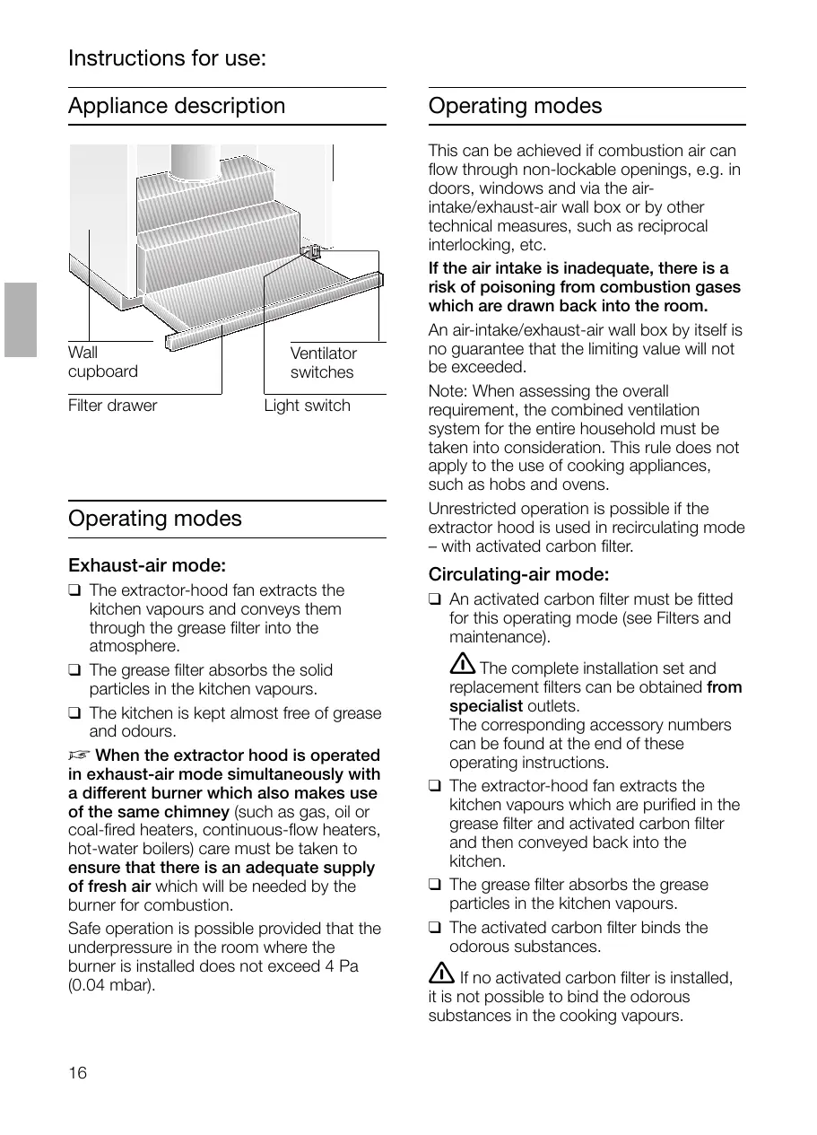 Instructions for use: Operating modes Appliance description Wall cupboard Filter drawer Ventilator switches Light switch Operating modes Exhaust-air mode: ❑ The extractor-hood fan extracts the kitchen vapours and conveys them through the grease filter into the atmosphere. ❑ The grease filter absorbs the solid particles in the kitchen vapours. ❑ The kitchen is kept almost free of grease and odours. D When the extractor hood is operated in exhaust-air mode simultaneously with a different burner which also makes use of the same chimney (such as gas, oil or coal-fired heaters, continuous-flow heaters, hot-water boilers) care must be taken to ensure that there is an adequate supply of fresh air which will be needed by the burner for combustion. Safe operation is possible provided that the underpressure in the room where the burner is installed does not exceed 4 Pa (0.04 mbar).