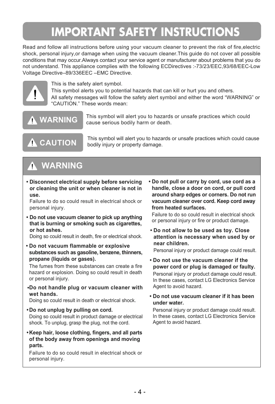 Read and follow all instructions before using your vacuum cleaner to prevent the risk of fire,electric shock, personal injury,or damage when using the vacuum cleaner.This guide do not cover all possible conditions that may occur.Always contact your service agent or manufacturer about problems that you do not understand. This appliance complies with the following ECDirectives :-73/23/EEC,93/68/EEC-Low Voltage Directive–89/336EEC –EMC Directive. This is the safety alert symbol. This symbol alerts you to potential hazards that can kill or hurt you and others. All safety messages will follow the safety alert symbol and either the word “WARNING” or “CAUTION.” These words mean: WARNING This symbol will alert you to hazards or unsafe practices which could cause serious bodily harm or death. CAUTION This symbol will alert you to hazards or unsafe practices which could cause bodily injury or property damage. WARNING