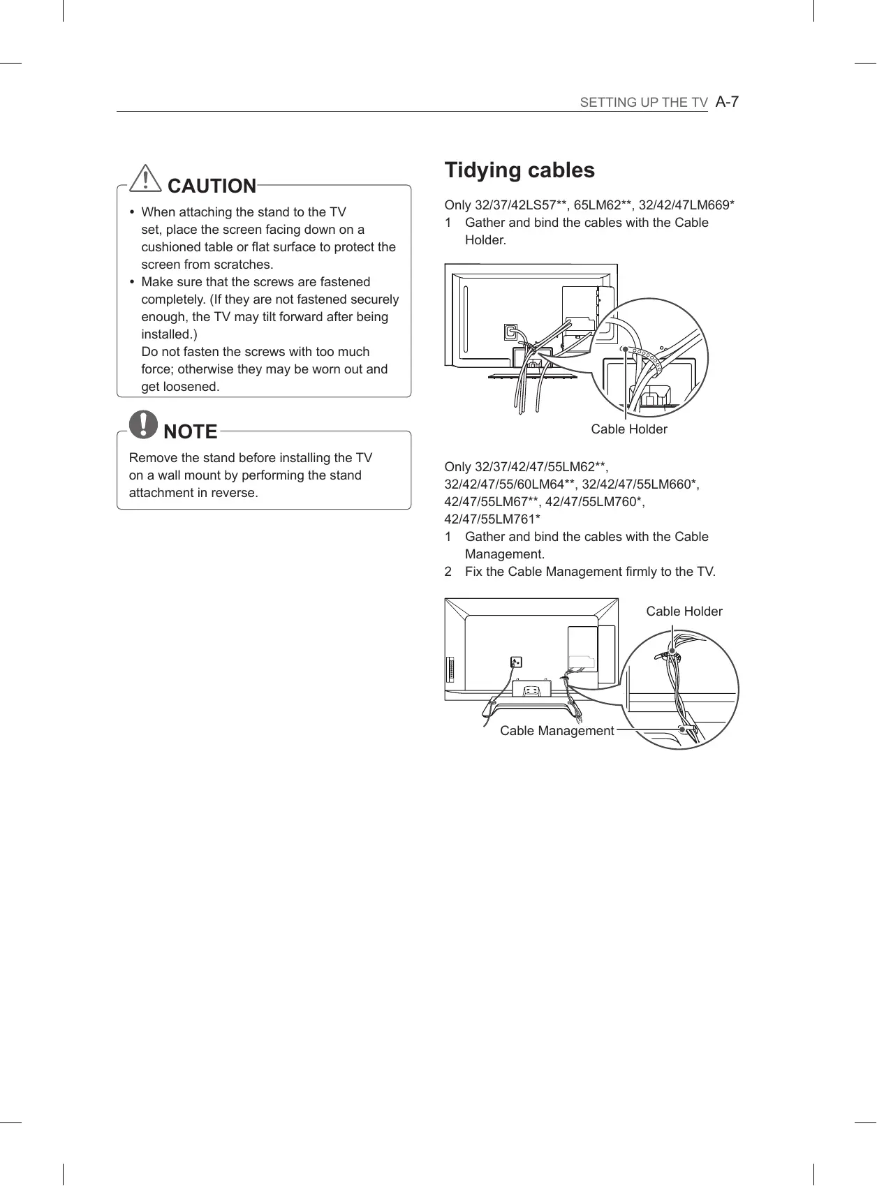 CAUTION yy When attaching the stand to the TV set, place the screen facing down on a cushioned table or flat surface to protect the screen from scratches. yy Make sure that the screws are fastened completely. (If they are not fastened securely enough, the TV may tilt forward after being installed.) Do not fasten the screws with too much force; otherwise they may be worn out and get loosened. NOTE Remove the stand before installing the TV on a wall mount by performing the stand attachment in reverse. Tidying cables Only 32/37/42LS57**, 65LM62**, 32/42/47LM669* 1 Gather and bind the cables with the Cable Holder. Cable Holder Only 32/37/42/47/55LM62**, 32/42/47/55/60LM64**, 32/42/47/55LM660*, 42/47/55LM67**, 42/47/55LM760*, 42/47/55LM761* 1 Gather and bind the cables with the Cable Management. 2 Fix the Cable Management firmly to the TV. Cable Holder Cable Management