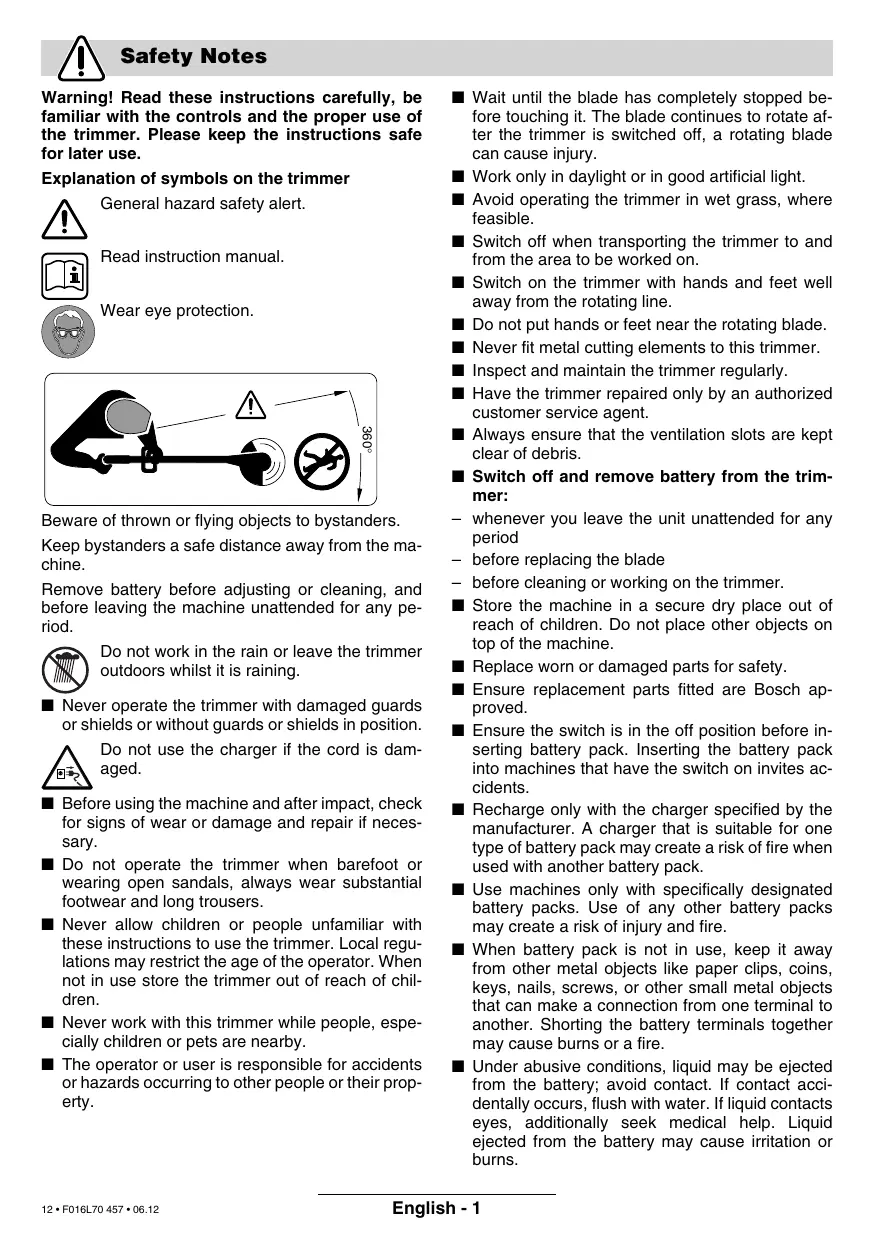 Robert Bosch GmbH, Power Tools Division Änderungen vorbehalten Dr. Eckerhard Strötgen Head of Product Certification Deutsch - 6 Safety Notes Warning! Read these instructions carefully, be familiar with the controls and the proper use of the trimmer. Please keep the instructions safe for later use. Explanation of symbols on the trimmer General hazard safety alert. Read instruction manual. Wear eye protection. 360° Beware of thrown or flying objects to bystanders. Keep bystanders a safe distance away from the machine. Remove battery before adjusting or cleaning, and before leaving the machine unattended for any period. Do not work in the rain or leave the trimmer outdoors whilst it is raining. ■ Never operate the trimmer with damaged guards or shields or without guards or shields in position. Do not use the charger if the cord is damaged. ■ Before using the machine and after impact, check for signs of wear or damage and repair if necessary. ■ Do not operate the trimmer when barefoot or wearing open sandals, always wear substantial footwear and long trousers. ■ Never allow children or people unfamiliar with these instructions to use the trimmer. Local regulations may restrict the age of the operator. When not in use store the trimmer out of reach of children. ■ Never work with this trimmer while people, especially children or pets are nearby. ■ The operator or user is responsible for accidents or hazards occurring to other people or their property. 12 • F016L70 457 • 06.12 ■ Wait until the blade has completely stopped before touching it. The blade continues to rotate after the trimmer is switched off, a rotating blade can cause injury. ■ Work only in daylight or in good artificial light. ■ Avoid operating the trimmer in wet grass, where feasible. ■ Switch off when transporting the trimmer to and from the area to be worked on. ■ Switch on the trimmer with hands and feet well away from the rotating line. ■ Do not put hands or feet near the rotating blade. ■ Never fit metal cutting elements to this trimmer. ■ Inspect and maintain the trimmer regularly. ■ Have the trimmer repaired only by an authorized customer service agent. ■ Always ensure that the ventilation slots are kept clear of debris. ■ Switch off and remove battery from the trimmer: – whenever you leave the unit unattended for any period – before replacing the blade – before cleaning or working on the trimmer. ■ Store the machine in a secure dry place out of reach of children. Do not place other objects on top of the machine. ■ Replace worn or damaged parts for safety. ■ Ensure replacement parts fitted are Bosch approved. ■ Ensure the switch is in the off position before inserting battery pack. Inserting the battery pack into machines that have the switch on invites accidents. ■ Recharge only with the charger specified by the manufacturer. A charger that is suitable for one type of battery pack may create a risk of fire when used with another battery pack. ■ Use machines only with specifically designated battery packs. Use of any other battery packs may create a risk of injury and fire. ■ When battery pack is not in use, keep it away from other metal objects like paper clips, coins, keys, nails, screws, or other small metal objects that can make a connection from one terminal to another. Shorting the battery terminals together may cause burns or a fire. ■ Under abusive conditions, liquid may be ejected from the battery; avoid contact. If contact accidentally occurs, flush with water. If liquid contacts eyes, additionally seek medical help. Liquid ejected from the battery may cause irritation or burns. English - 1 Product Specification Trimmer