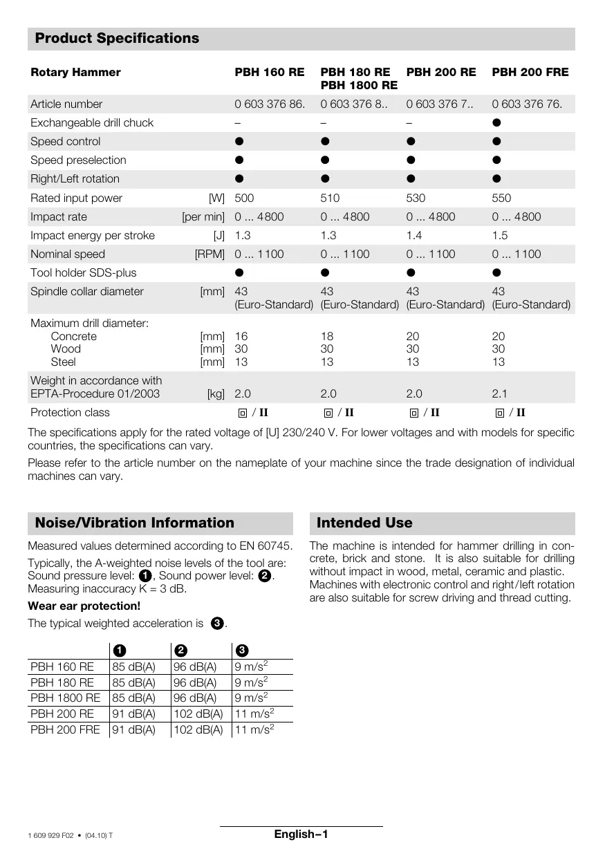 / II / II The specifications apply for the rated voltage of [U] 230/240 V. For lower voltages and with models for specific countries, the specifications can vary. Please refer to the article number on the nameplate of your machine since the trade designation of individual machines can vary. Noise/Vibration Information Intended Use Measured values determined according to EN 60745. Typically, the A-weighted noise levels of the tool are: Sound pressure level: 1 , Sound power level: 2 . Measuring inaccuracy K = 3 dB. Wear ear protection! The typical weighted acceleration is 3 .