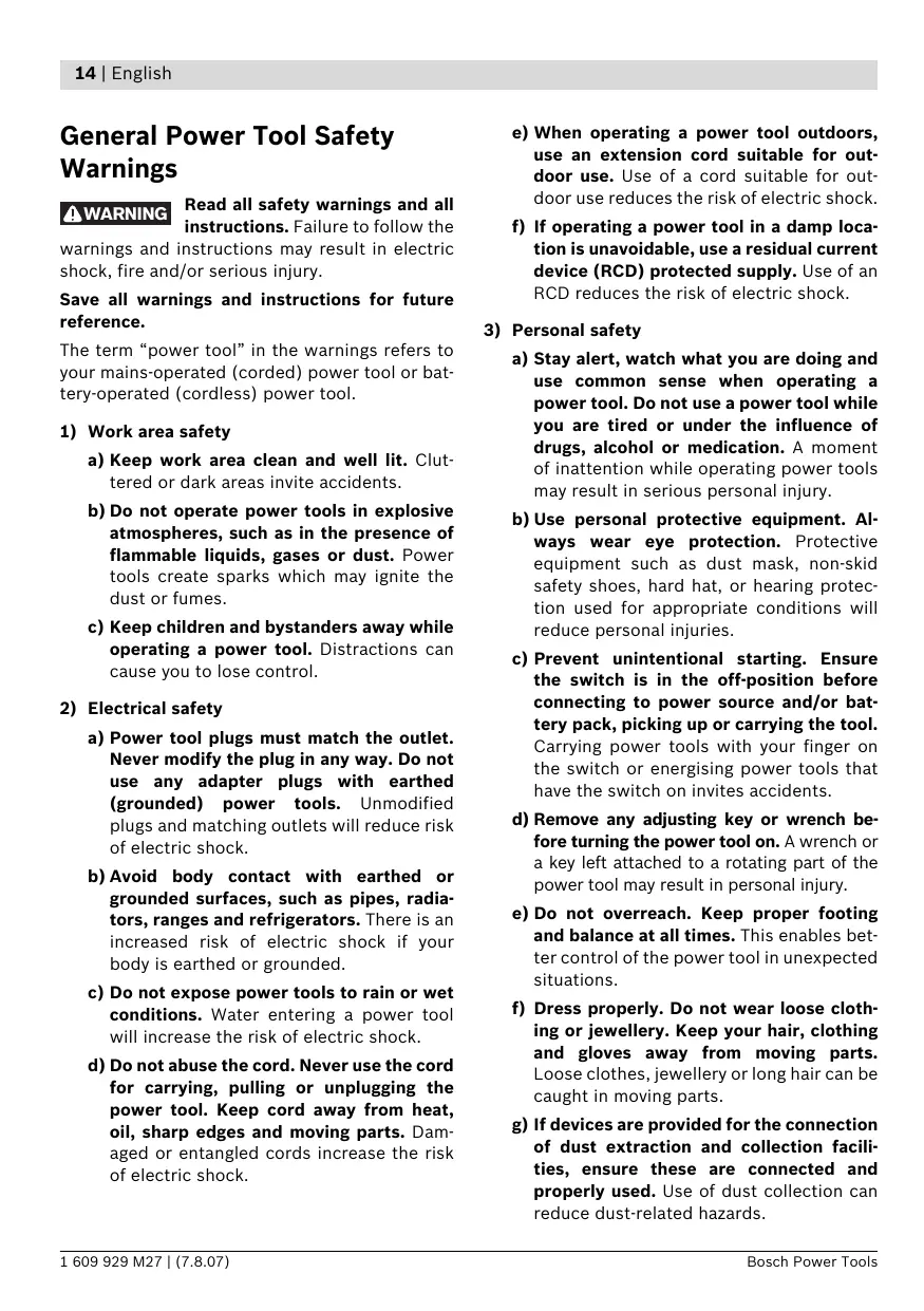 1 609 929 M27 | (7.8.07) Bosch Power Tools Deutsch | 5 Bosch Power Tools Bosch Power Tools Bosch Power Tools Bosch Power Tools Deutsch | 9 Dr. Eckerhard Strötgen Head of Product Certification Bosch Power Tools Bosch Power Tools 1 609 929 M27 | (7.8.07) 12 | Deutsch Bosch Power Tools Bosch Power Tools 1 609 929 M27 | (7.8.07) 14 | English Read all safety warnings and all instructions. Failure to follow the warnings and instructions may result in electric shock, fire and/or serious injury. WARNING Save all warnings and instructions for future reference. The term “power tool” in the warnings refers to your mains-operated (corded) power tool or battery-operated (cordless) power tool.
