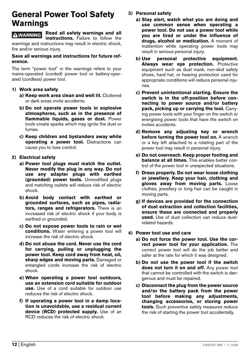 a) Do not force the power tool. Use the correct power tool for your application. The correct power tool will do the job better and safer at the rate for which it was designed. b) Do not use the power tool if the switch does not turn it on and off. Any power tool that cannot be controlled with the switch is dangerous and must be repaired. c) Disconnect the plug from the power source and/or the battery pack from the power tool before making any adjustments, changing accessories, or storing power tools. Such preventive safety measures reduce the risk of starting the power tool accidentally. 2 609 001 965 • 11.10.06 d) Store idle power tools out of the reach of children and do not allow persons unfamiliar with the power tool or these instructions to operate the power tool. Power tools are dangerous in the hands of untrained users. e) Maintain power tools. Check for misalignment or binding of moving parts, breakage of parts and any other condition that may affect the power tool’s operation. If damaged, have the power tool repaired before use. Many accidents are caused by poorly maintained power tools. f) Keep cutting tools sharp and clean. Properly maintained cutting tools with sharp cutting edges are less likely to bind and are easier to control. g) Use the power tool, accessories and tool bits etc. in accordance with these instructions, taking into account the working conditions and the work to be performed. Use of the power tool for operations different from those intended could result in a hazardous situation.