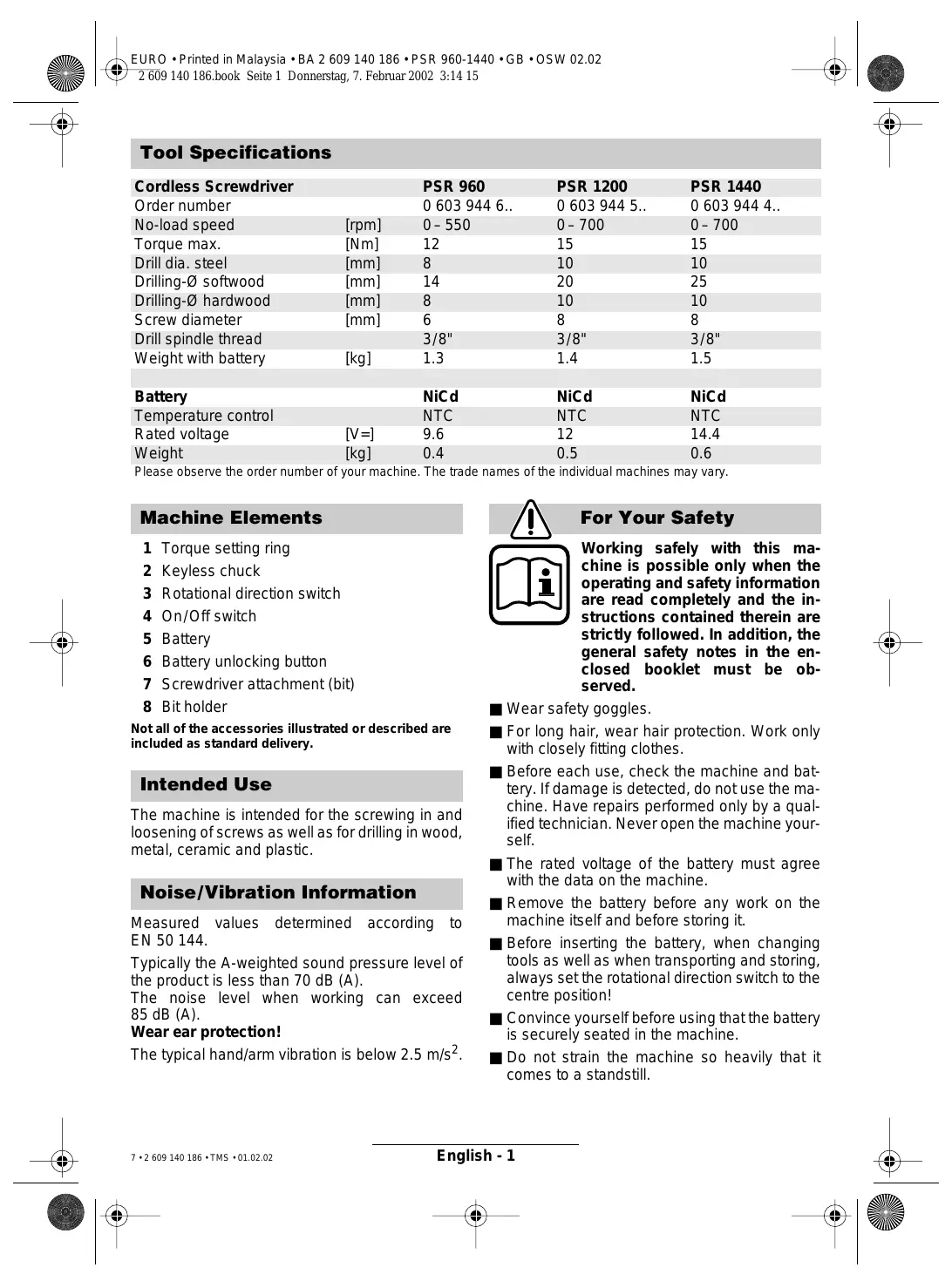 Intended Use The machine is intended for the screwing in and loosening of screws as well as for drilling in wood, metal, ceramic and plastic. Noise/Vibration Information
