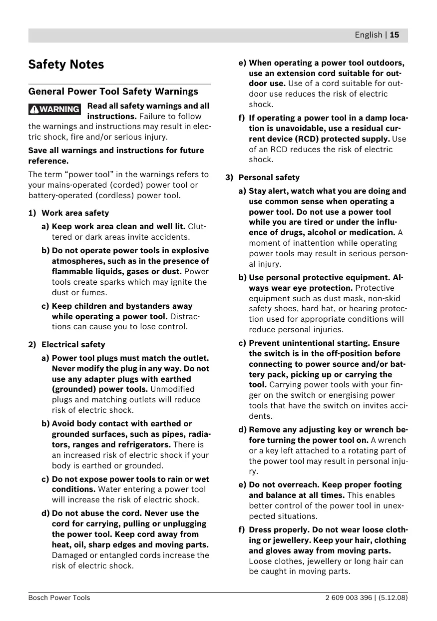 3) Personal safety a) Stay alert, watch what you are doing and use common sense when operating a power tool. Do not use a power tool while you are tired or under the influence of drugs, alcohol or medication. A moment of inattention while operating power tools may result in serious personal injury. b) Use personal protective equipment. Always wear eye protection. Protective equipment such as dust mask, non-skid safety shoes, hard hat, or hearing protection used for appropriate conditions will reduce personal injuries. c) Prevent unintentional starting. Ensure the switch is in the off-position before connecting to power source and/or battery pack, picking up or carrying the tool. Carrying power tools with your finger on the switch or energising power tools that have the switch on invites accidents. d) Remove any adjusting key or wrench before turning the power tool on. A wrench or a key left attached to a rotating part of the power tool may result in personal injury. e) Do not overreach. Keep proper footing and balance at all times. This enables better control of the power tool in unexpected situations. f) Dress properly. Do not wear loose clothing or jewellery. Keep your hair, clothing and gloves away from moving parts. Loose clothes, jewellery or long hair can be caught in moving parts. 2 609 003 396 | (5.12.08)