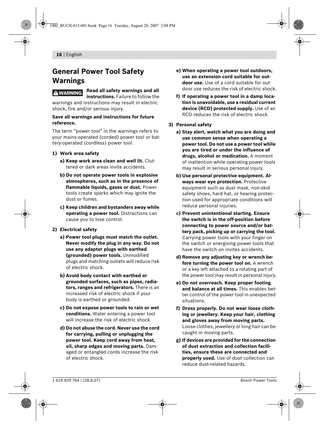 a) Stay alert, watch what you are doing and use common sense when operating a power tool. Do not use a power tool while you are tired or under the influence of drugs, alcohol or medication. A moment of inattention while operating power tools may result in serious personal injury. b) Use personal protective equipment. Always wear eye protection. Protective equipment such as dust mask, non-skid safety shoes, hard hat, or hearing protection used for appropriate conditions will reduce personal injuries. c) Prevent unintentional starting. Ensure the switch is in the off-position before connecting to power source and/or battery pack, picking up or carrying the tool. Carrying power tools with your finger on the switch or energising power tools that have the switch on invites accidents. d) Remove any adjusting key or wrench before turning the power tool on. A wrench or a key left attached to a rotating part of the power tool may result in personal injury. e) Do not overreach. Keep proper footing and balance at all times. This enables better control of the power tool in unexpected situations. f) Dress properly. Do not wear loose clothing or jewellery. Keep your hair, clothing and gloves away from moving parts. Loose clothes, jewellery or long hair can be caught in moving parts. g) If devices are provided for the connection of dust extraction and collection facilities, ensure these are connected and properly used. Use of dust collection can reduce dust-related hazards. Bosch Power Tools OBJ_BUCH-415-001.book Page 17 Tuesday, August 28, 2007 2:08 PM English | 17