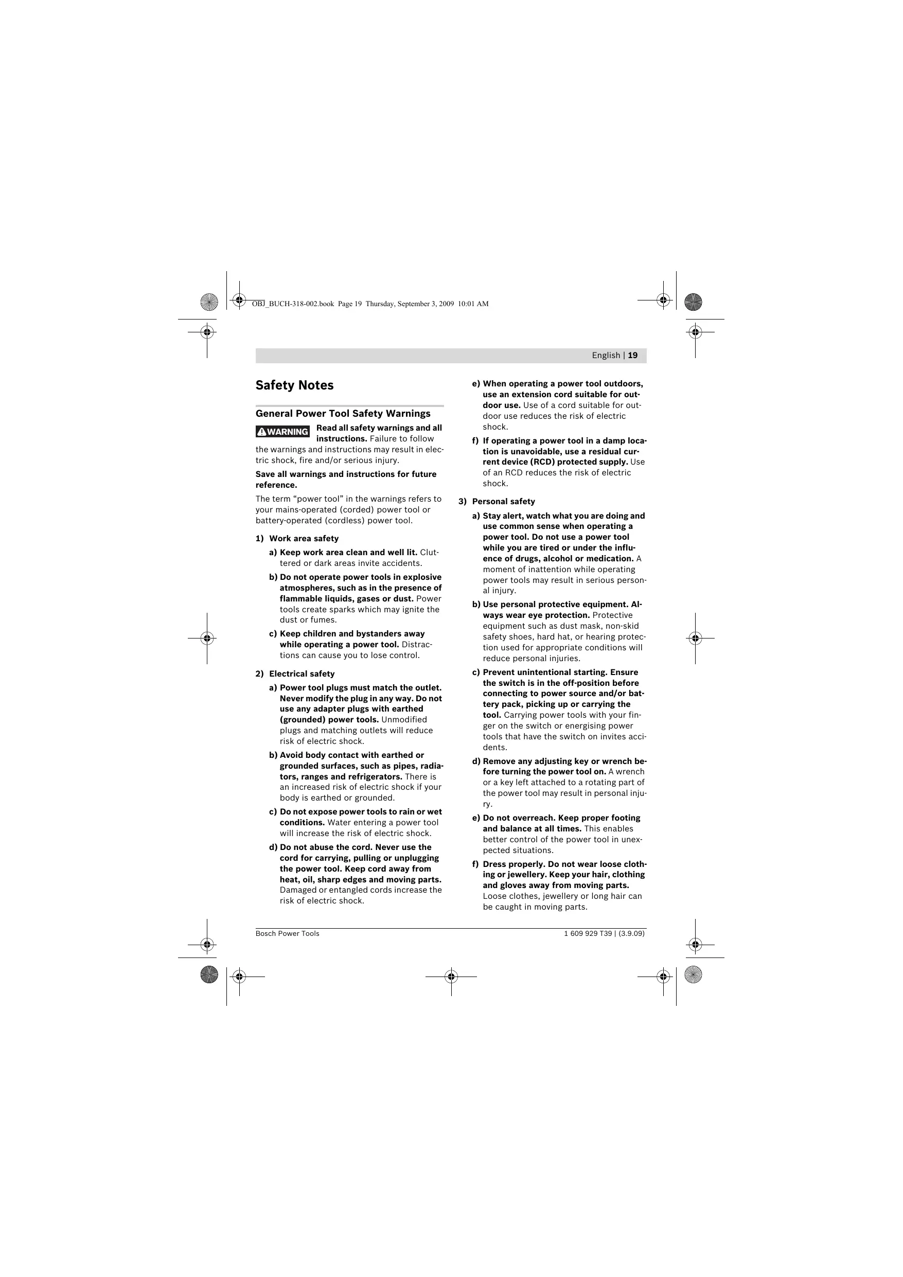 a) Stay alert, watch what you are doing and use common sense when operating a power tool. Do not use a power tool while you are tired or under the influence of drugs, alcohol or medication. A moment of inattention while operating power tools may result in serious personal injury. b) Use personal protective equipment. Always wear eye protection. Protective equipment such as dust mask, non-skid safety shoes, hard hat, or hearing protection used for appropriate conditions will reduce personal injuries. c) Prevent unintentional starting. Ensure the switch is in the off-position before connecting to power source and/or battery pack, picking up or carrying the tool. Carrying power tools with your finger on the switch or energising power tools that have the switch on invites accidents. d) Remove any adjusting key or wrench before turning the power tool on. A wrench or a key left attached to a rotating part of the power tool may result in personal injury. e) Do not overreach. Keep proper footing and balance at all times. This enables better control of the power tool in unexpected situations. f) Dress properly. Do not wear loose clothing or jewellery. Keep your hair, clothing and gloves away from moving parts. Loose clothes, jewellery or long hair can be caught in moving parts. 1 609 929 T39 | (3.9.09) OBJ_BUCH-318-002.book Page 20 Thursday, September 3, 2009 10:01 AM 20 | English g) If devices are provided for the connection of dust extraction and collection facilities, ensure these are connected and properly used. Use of dust collection can reduce dust-related hazards.