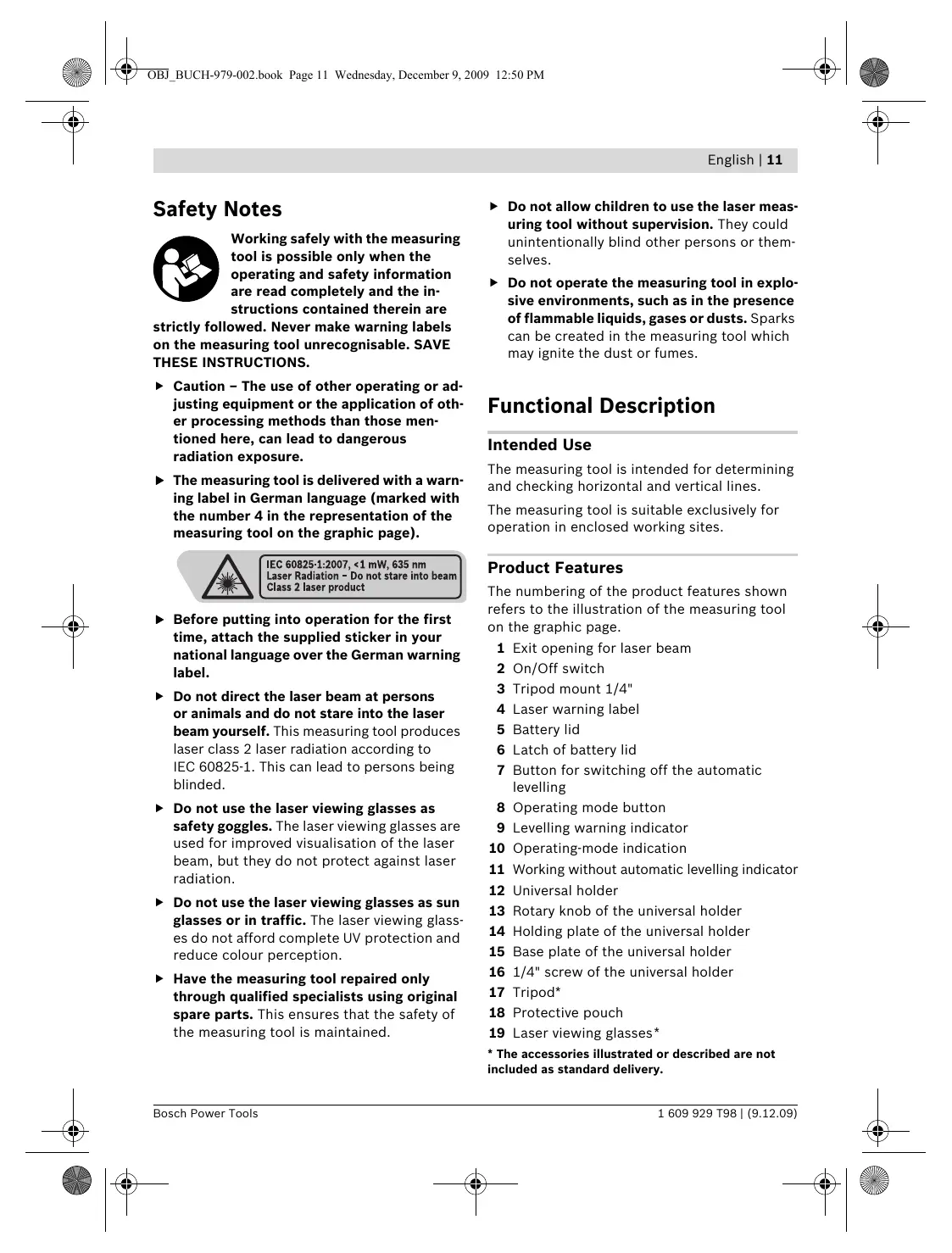 Bosch Power Tools OBJ_BUCH-979-002.book Page 7 Wednesday, December 9, 2009 12:50 PM Deutsch | 7 4 x 1,5 V LR6 (AA) 4 x 1,2 V HR6 (AA) 12 h OBJ_BUCH-979-002.book Page 8 Wednesday, December 9, 2009 12:50 PM Bosch Power Tools OBJ_BUCH-979-002.book Page 9 Wednesday, December 9, 2009 12:50 PM Bosch Power Tools OBJ_BUCH-979-002.book Page 10 Wednesday, December 9, 2009 12:50 PM Bosch Power Tools OBJ_BUCH-979-002.book Page 11 Wednesday, December 9, 2009 12:50 PM English | 11 Working safely with the measuring tool is possible only when the operating and safety information are read completely and the instructions contained therein are strictly followed. Never make warning labels on the measuring tool unrecognisable. SAVE THESE INSTRUCTIONS. f Caution – The use of other operating or adjusting equipment or the application of other processing methods than those mentioned here, can lead to dangerous radiation exposure. f The measuring tool is delivered with a warning label in German language (marked with the number 4 in the representation of the measuring tool on the graphic page). f Do not allow children to use the laser measuring tool without supervision. They could unintentionally blind other persons or themselves. f Do not operate the measuring tool in explosive environments, such as in the presence of flammable liquids, gases or dusts. Sparks can be created in the measuring tool which may ignite the dust or fumes. Functional Description Intended Use The measuring tool is intended for determining and checking horizontal and vertical lines. The measuring tool is suitable exclusively for operation in enclosed working sites. Product Features f Before putting into operation for the first time, attach the supplied sticker in your national language over the German warning label. f Do not direct the laser beam at persons or animals and do not stare into the laser beam yourself. This measuring tool produces laser class 2 laser radiation according to IEC 60825-1. This can lead to persons being blinded. f Do not use the laser viewing glasses as safety goggles. The laser viewing glasses are used for improved visualisation of the laser beam, but they do not protect against laser radiation. f Do not use the laser viewing glasses as sun glasses or in traffic. The laser viewing glasses do not afford complete UV protection and reduce colour perception. f Have the measuring tool repaired only through qualified specialists using original spare parts. This ensures that the safety of the measuring tool is maintained. The numbering of the product features shown refers to the illustration of the measuring tool on the graphic page.