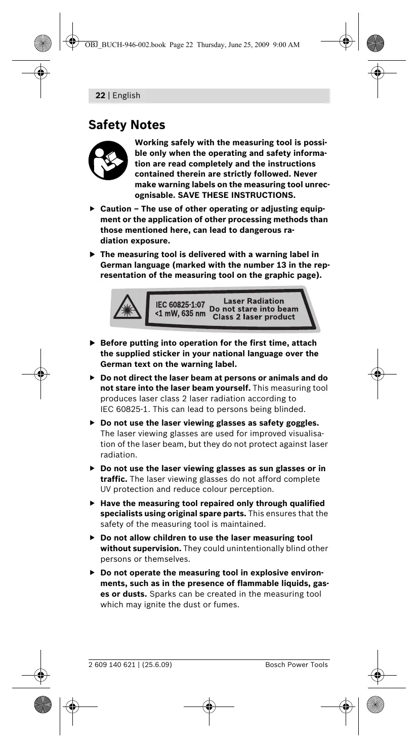 German text on the warning label. f Do not direct the laser beam at persons or animals and do not stare into the laser beam yourself. This measuring tool produces laser class 2 laser radiation according to IEC 60825-1. This can lead to persons being blinded. f Do not use the laser viewing glasses as safety goggles. The laser viewing glasses are used for improved visualisation of the laser beam, but they do not protect against laser radiation. f Do not use the laser viewing glasses as sun glasses or in traffic. The laser viewing glasses do not afford complete UV protection and reduce colour perception. f Have the measuring tool repaired only through qualified specialists using original spare parts. This ensures that the safety of the measuring tool is maintained. f Do not allow children to use the laser measuring tool without supervision. They could unintentionally blind other persons or themselves. f Do not operate the measuring tool in explosive environments, such as in the presence of flammable liquids, gases or dusts. Sparks can be created in the measuring tool which may ignite the dust or fumes.