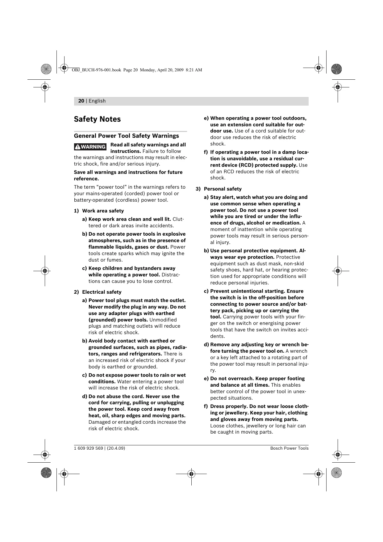 a) Stay alert, watch what you are doing and use common sense when operating a power tool. Do not use a power tool while you are tired or under the influence of drugs, alcohol or medication. A moment of inattention while operating power tools may result in serious personal injury. b) Use personal protective equipment. Always wear eye protection. Protective equipment such as dust mask, non-skid safety shoes, hard hat, or hearing protection used for appropriate conditions will reduce personal injuries. c) Prevent unintentional starting. Ensure the switch is in the off-position before connecting to power source and/or battery pack, picking up or carrying the tool. Carrying power tools with your finger on the switch or energising power tools that have the switch on invites accidents. d) Remove any adjusting key or wrench before turning the power tool on. A wrench or a key left attached to a rotating part of the power tool may result in personal injury. e) Do not overreach. Keep proper footing and balance at all times. This enables better control of the power tool in unexpected situations. f) Dress properly. Do not wear loose clothing or jewellery. Keep your hair, clothing and gloves away from moving parts. Loose clothes, jewellery or long hair can be caught in moving parts. Bosch Power Tools OBJ_BUCH-976-001.book Page 21 Monday, April 20, 2009 8:21 AM English | 21 g) If devices are provided for the connection of dust extraction and collection facilities, ensure these are connected and properly used. Use of dust collection can reduce dust-related hazards.