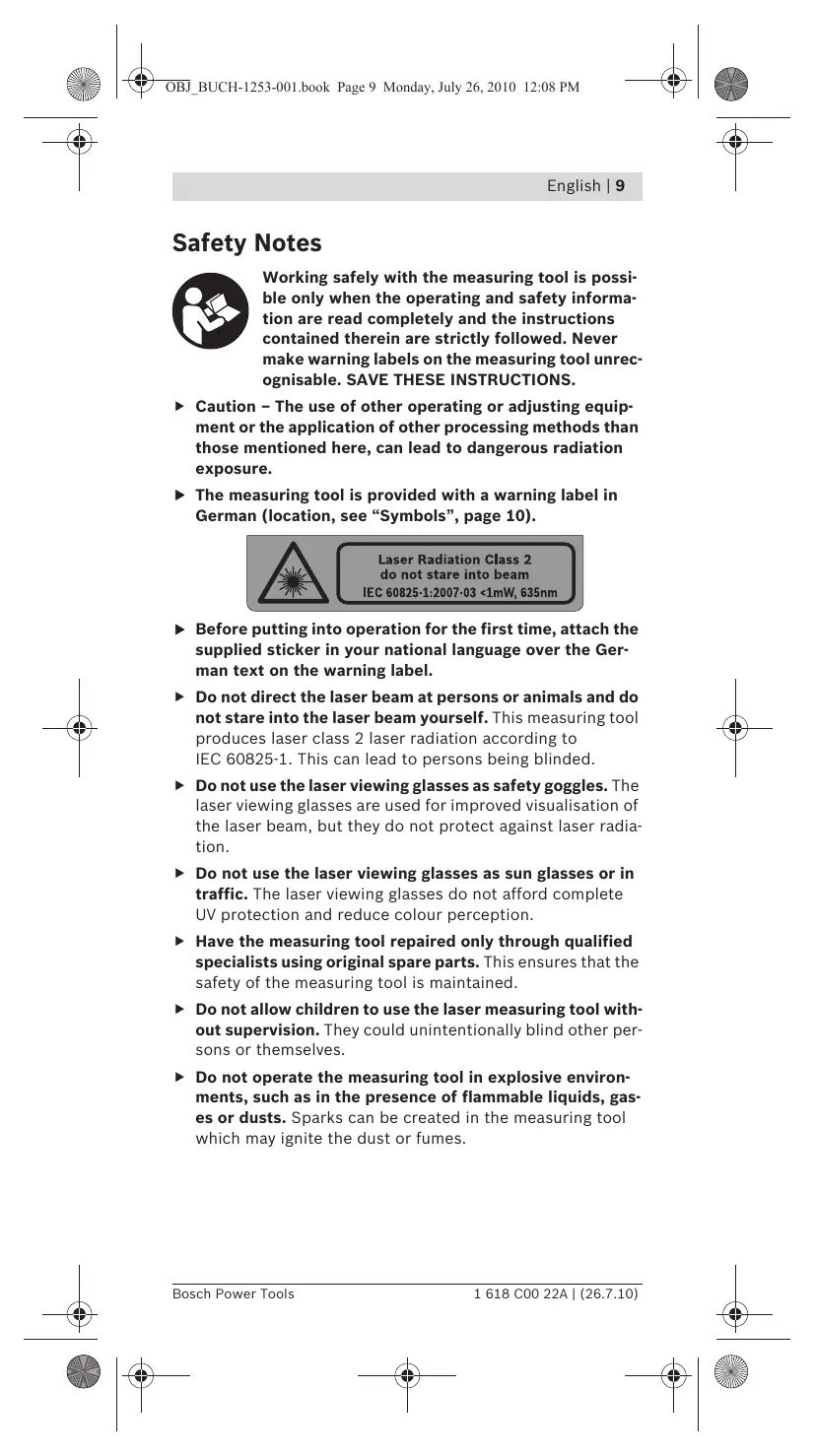 Bosch Power Tools 1 618 C00 22A | (26.7.10) OBJ_BUCH-1253-001.book Page 4 Monday, July 26, 2010 12:08 PM 4 | Deutsch Bosch Power Tools OBJ_BUCH-1253-001.book Page 5 Monday, July 26, 2010 12:08 PM Deutsch | 5 OBJ_BUCH-1253-001.book Page 6 Monday, July 26, 2010 12:08 PM 6 | Deutsch Symbol Bosch Power Tools OBJ_BUCH-1253-001.book Page 7 Monday, July 26, 2010 12:08 PM Deutsch | 7 Bosch Power Tools 1 618 C00 22A | (26.7.10) OBJ_BUCH-1253-001.book Page 8 Monday, July 26, 2010 12:08 PM Bosch Power Tools OBJ_BUCH-1253-001.book Page 9 Monday, July 26, 2010 12:08 PM English | 9 Working safely with the measuring tool is possible only when the operating and safety information are read completely and the instructions contained therein are strictly followed. Never make warning labels on the measuring tool unrecognisable. SAVE THESE INSTRUCTIONS. f Caution – The use of other operating or adjusting equipment or the application of other processing methods than those mentioned here, can lead to dangerous radiation exposure. f The measuring tool is provided with a warning label in German (location, see “Symbols”, page 10). f Before putting into operation for the first time, attach the supplied sticker in your national language over the German text on the warning label. f Do not direct the laser beam at persons or animals and do not stare into the laser beam yourself. This measuring tool produces laser class 2 laser radiation according to IEC 60825-1. This can lead to persons being blinded. f Do not use the laser viewing glasses as safety goggles. The laser viewing glasses are used for improved visualisation of the laser beam, but they do not protect against laser radiation. f Do not use the laser viewing glasses as sun glasses or in traffic. The laser viewing glasses do not afford complete UV protection and reduce colour perception. f Have the measuring tool repaired only through qualified specialists using original spare parts. This ensures that the safety of the measuring tool is maintained. f Do not allow children to use the laser measuring tool without supervision. They could unintentionally blind other persons or themselves. f Do not operate the measuring tool in explosive environments, such as in the presence of flammable liquids, gases or dusts. Sparks can be created in the measuring tool which may ignite the dust or fumes. Bosch Power Tools 1 618 C00 22A | (26.7.10) OBJ_BUCH-1253-001.book Page 10 Monday, July 26, 2010 12:08 PM 10 | English Additional Safety and Working Instructions f Alkali-manganese batteries are recommended for the measuring tool. f Remove the batteries from the measuring tool when not using it for extended periods. When storing for extended periods, the batteries can corrode and discharge themselves. f Protect the measuring tool against moisture and direct sun light. f Do not subject the measuring tool to extreme temperatures or variations in temperature. As an example, do not leave it in vehicles for longer periods. In case of large variations in temperature, allow the measuring tool to adjust to the ambient temperature before putting it into operation. In case of extreme temperatures or variations in temperature, the accuracy of the measuring tool can be impaired. f Avoid heavy impact to or falling down of the measuring tool. Damage to the measuring tool can impair its accuracy. After heavy impact or shock, compare the laser line with a known horizontal or vertical reference line. f When switching on the measuring tool, do not direct the laser beam at persons or animals and do not stare into the laser beam yourself. Immediately after switching on, the measuring tool sends laser beams out of the exit opening. f Switch the measuring tool off during transport. When switching off, the levelling unit, which can be damaged in case of intense movement, is locked. f Do not leave the switched on measuring tool unattended and switch the measuring tool off after use. Other persons could be blinded by the laser beam. f Always use the centre of the laser line for marking. The width of the laser line changes with the distance. f In case of ground vibrations or position changes during operation, the measuring tool is automatically levelled in again. To avoid errors, check the position of the horizontal and vertical laser line with regard to the reference points upon re-levelling. Symbols The following symbols are important for reading and understanding the operating instructions. Please take note of the symbols and their meaning. The correct interpretation of the symbols will help you to use the measuring tool in a better and safer manner. 1 618 C00 22A | (26.7.10) Bosch Power Tools OBJ_BUCH-1253-001.book Page 11 Monday, July 26, 2010 12:08 PM English | 11 Symbol Meaning Quigo: Cross-line Laser Position of the laser warning label Read all safety warnings and all instructions Do not direct the laser beam at persons or animals and do not stare into the laser beam yourself. Movement direction Reaction direction Next step of action Switching On Switching Off Prohibited action Correct result Working range (radius), to approx. Levelling Accuracy Self-levelling range, typically Levelling duration, typically Operating temperature Storage temperature Bosch Power Tools Relative air humidity, max. 1 618 C00 22A | (26.7.10) OBJ_BUCH-1253-001.book Page 12 Monday, July 26, 2010 12:08 PM 12 | English Symbol Meaning Laser class