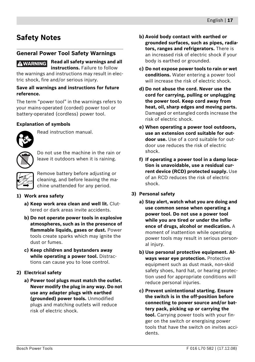 a) Stay alert, watch what you are doing and use common sense when operating a power tool. Do not use a power tool while you are tired or under the influence of drugs, alcohol or medication. A moment of inattention while operating power tools may result in serious personal injury. b) Use personal protective equipment. Always wear eye protection. Protective equipment such as dust mask, non-skid safety shoes, hard hat, or hearing protection used for appropriate conditions will reduce personal injuries. c) Prevent unintentional starting. Ensure the switch is in the off-position before connecting to power source and/or battery pack, picking up or carrying the tool. Carrying power tools with your finger on the switch or energising power tools that have the switch on invites accidents. F 016 L70 582 | (17.12.08) 18 | English d) Remove any adjusting key or wrench before turning the power tool on. A wrench or a key left attached to a rotating part of the power tool may result in personal injury. e) Do not overreach. Keep proper footing and balance at all times. This enables better control of the power tool in unexpected situations. f) Dress properly. Do not wear loose clothing or jewellery. Keep your hair, clothing and gloves away from moving parts. Loose clothes, jewellery or long hair can be caught in moving parts. g) If devices are provided for the connection of dust extraction and collection facilities, ensure these are connected and properly used. Use of dust collection can reduce dust-related hazards.