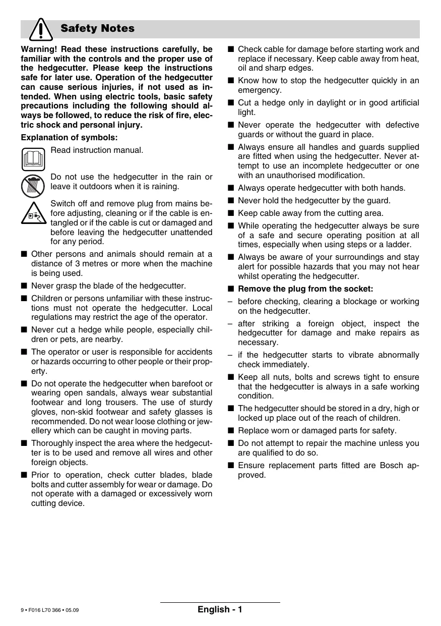 Switch off and remove plug from mains before adjusting, cleaning or if the cable is entangled or if the cable is cut or damaged and before leaving the hedgecutter unattended for any period. Other persons and animals should remain at a distance of 3 metres or more when the machine is being used. Never grasp the blade of the hedgecutter. Children or persons unfamiliar with these instructions must not operate the hedgecutter. Local regulations may restrict the age of the operator. Never cut a hedge while people, especially children or pets, are nearby. The operator or user is responsible for accidents or hazards occurring to other people or their property. Do not operate the hedgecutter when barefoot or wearing open sandals, always wear substantial footwear and long trousers. The use of sturdy gloves, non-skid footwear and safety glasses is recommended. Do not wear loose clothing or jewellery which can be caught in moving parts. Thoroughly inspect the area where the hedgecutter is to be used and remove all wires and other foreign objects. Prior to operation, check cutter blades, blade bolts and cutter assembly for wear or damage. Do not operate with a damaged or excessively worn cutting device. 9 • F016 L70 366 • 05.09 ■ Check cable for damage before starting work and replace if necessary. Keep cable away from heat, oil and sharp edges. ■ Know how to stop the hedgecutter quickly in an emergency. ■ Cut a hedge only in daylight or in good artificial light. ■ Never operate the hedgecutter with defective guards or without the guard in place. ■ Always ensure all handles and guards supplied are fitted when using the hedgecutter. Never attempt to use an incomplete hedgecutter or one with an unauthorised modification. ■ Always operate hedgecutter with both hands. ■ Never hold the hedgecutter by the guard. ■ Keep cable away from the cutting area. ■ While operating the hedgecutter always be sure of a safe and secure operating position at all times, especially when using steps or a ladder. ■ Always be aware of your surroundings and stay alert for possible hazards that you may not hear whilst operating the hedgecutter. ■ Remove the plug from the socket: – before checking, clearing a blockage or working on the hedgecutter. – after striking a foreign object, inspect the hedgecutter for damage and make repairs as necessary. – if the hedgecutter starts to vibrate abnormally check immediately. ■ Keep all nuts, bolts and screws tight to ensure that the hedgecutter is always in a safe working condition. ■ The hedgecutter should be stored in a dry, high or locked up place out of the reach of children. ■ Replace worn or damaged parts for safety. ■ Do not attempt to repair the machine unless you are qualified to do so. ■ Ensure replacement parts fitted are Bosch approved. English - 1 Product Specification Hedgecutter Part number Rated power No-load stroke rate Blade spacing Cutting length Weight Protection class Hedgecutter Part number Rated power No-load stroke rate Blade spacing Cutting length Weight Protection class The product is intended for cutting and trimming hedges and bushes in domestic use. Introduction This manual gives instructions on the correct assembly and safe use of your hedgecutter. It is important that you read these instructions carefully.