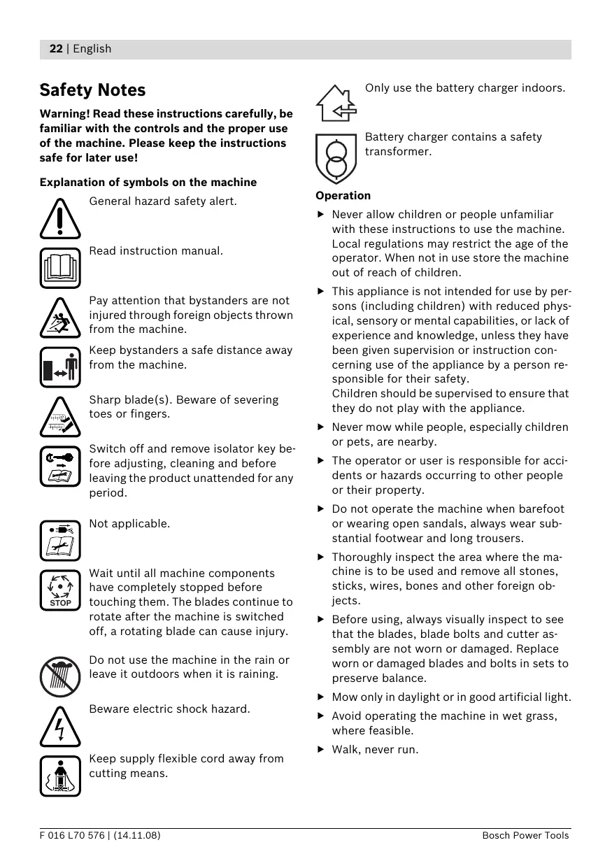 Bosch Power Tools Dr. Eckerhard Strötgen Head of Product Certification Bosch Power Tools Bosch Power Tools F 016 L70 576 | (14.11.08) 14 | Deutsch Bosch Power Tools Deutsch | 15 Bosch Power Tools Bosch Power Tools Deutsch | 17 Bosch Power Tools F 016 L70 576 | (14.11.08) 18 | Deutsch Symptome Mögliche Ursache Abhilfe Bosch Power Tools Deutsch | 19 Symptome Mögliche Ursache Abhilfe Bosch Power Tools F 016 L70 576 | (14.11.08) 20 | Deutsch Bosch Power Tools Bosch Power Tools F 016 L70 576 | (14.11.08) 22 | English Warning! Read these instructions carefully, be familiar with the controls and the proper use of the machine. Please keep the instructions safe for later use! Explanation of symbols on the machine General hazard safety alert. Read instruction manual. Pay attention that bystanders are not injured through foreign objects thrown from the machine. Keep bystanders a safe distance away from the machine. Sharp blade(s). Beware of severing toes or fingers. Switch off and remove isolator key before adjusting, cleaning and before leaving the product unattended for any period. Not applicable. STOP Wait until all machine components have completely stopped before touching them. The blades continue to rotate after the machine is switched off, a rotating blade can cause injury. Do not use the machine in the rain or leave it outdoors when it is raining. Beware electric shock hazard. Keep supply flexible cord away from cutting means. F 016 L70 576 | (14.11.08) Only use the battery charger indoors. Battery charger contains a safety transformer. Operation f Never allow children or people unfamiliar with these instructions to use the machine. Local regulations may restrict the age of the operator. When not in use store the machine out of reach of children. f This appliance is not intended for use by persons (including children) with reduced physical, sensory or mental capabilities, or lack of experience and knowledge, unless they have been given supervision or instruction concerning use of the appliance by a person responsible for their safety. Children should be supervised to ensure that they do not play with the appliance. f Never mow while people, especially children or pets, are nearby. f The operator or user is responsible for accidents or hazards occurring to other people or their property. f Do not operate the machine when barefoot or wearing open sandals, always wear substantial footwear and long trousers. f Thoroughly inspect the area where the machine is to be used and remove all stones, sticks, wires, bones and other foreign objects. f Before using, always visually inspect to see that the blades, blade bolts and cutter assembly are not worn or damaged. Replace worn or damaged blades and bolts in sets to preserve balance. f Mow only in daylight or in good artificial light. f Avoid operating the machine in wet grass, where feasible. f Walk, never run. Bosch Power Tools English | 23 f Never operate the appliance with defective guards or shields, or without safety devices, for example deflectors and/or grass catchers in place. f Working on banks can be dangerous. – Do not mow excessively steep slopes. – Always be sure of your footing on slopes or wet grass. – Mow across the face of slopes – never up and down. – Exercise extreme caution when changing direction on slopes. Remove the isolator key: – whenever you leave the machine, – before clearing a blockage, – before checking, cleaning or working on the machine, – after striking a foreign object. Inspect the machine for damage and make repairs as necessary, – if the machine starts to vibrate abnormally (check immediately). Maintenance f Use extreme caution when stepping back or pulling the machine towards you. f Keep all nuts, bolts and screws tight to be sure that the machine is in safe working condition. f Never mow by pulling the mower towards you. f Check the grass catcher frequently for wear or deterioration. f Stop the blades if the machine has to be tilted for transportation when crossing surfaces other than grass and when transporting the machine to and from the area to be mowed. f Examine the machine and replace worn or damaged parts for safety. f Do not tilt the machine when starting or switching on the motor, except if the machine has to be tilted for starting in long grass. In this case, do not tilt if more than absolutely necessary and tilt only the part which is away from the operator. Always ensure that both hands are in the operating position before returning the machine to the ground. f Switch on the motor according to the instructions with feet well away from rotating parts. f Do not put hands or feet near or under rotating parts. f Always stand clear of the discharge zone when operating the machine. f Never pick up or carry the machine while the motor is running. f Ensure replacement cutting means of the right type are used. f Ensure replacement parts fitted are Bosch approved. f Always wear gardening gloves when handling or working near the sharp blades. Recommendations for Optimal Handling of the Battery f Ensure the switch is in the off position before inserting battery pack. Inserting the battery pack into machines that have the switch on invites accidents. f Keep the battery charger away from rain or moisture. Penetration of water in the battery charger increases the risk of an electric shock. f Recharge only with the charger specified by the manufacturer. A charger that is suitable for one type of battery pack may create a risk of fire when used with another battery pack. f Do not charge other batteries. The battery charger is suitable only for charging Bosch lithium ion batteries within the listed voltage range. Otherwise there is danger of fire and explosion. f Keep the battery charger clean. Contamination can lead to danger of an electric shock. Bosch Power Tools F 016 L70 576 | (14.11.08) 24 | English f Before each use, check the battery charger, cable and plug. If damage is detected, do not u