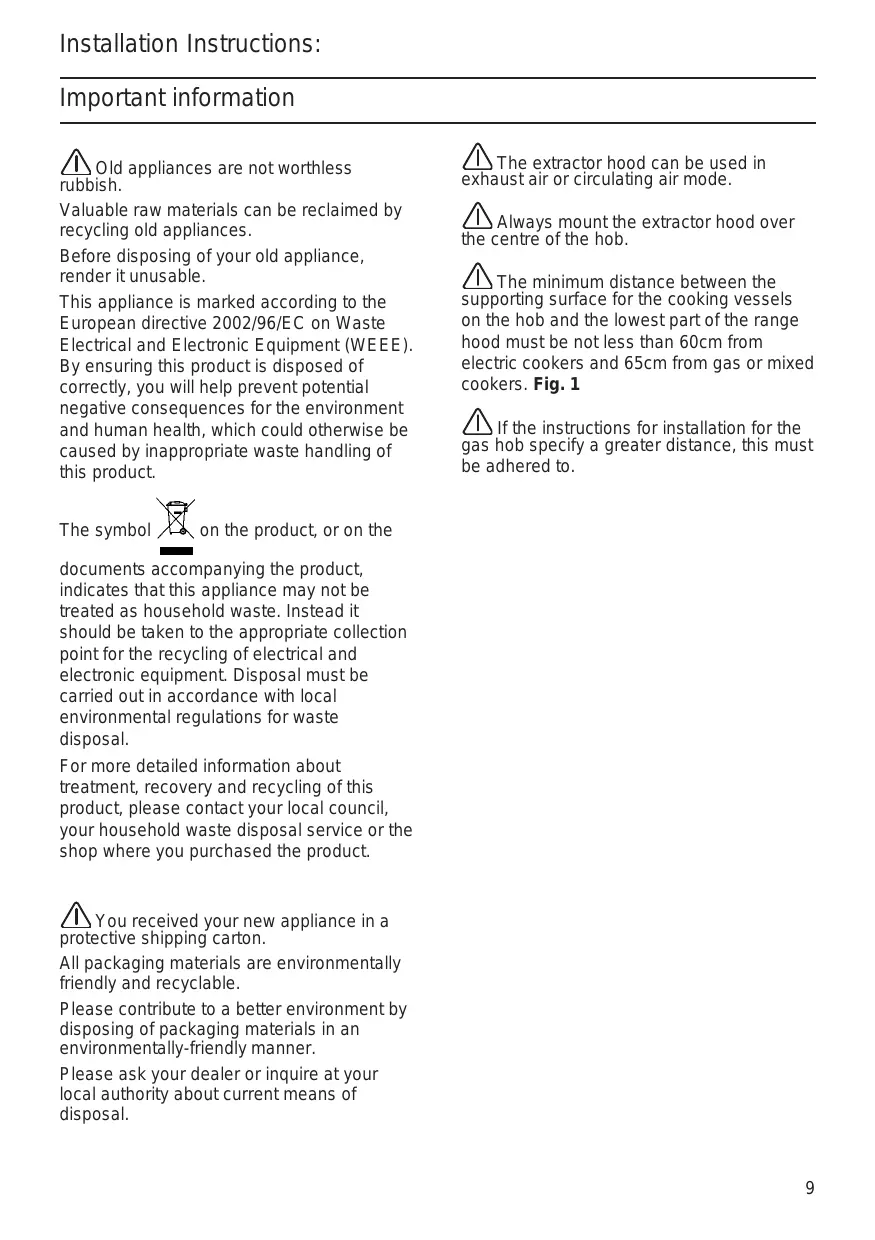 Installation Instructions: Important information Old appliances are not worthless rubbish. Valuable raw materials can be reclaimed by recycling old appliances. Before disposing of your old appliance, render it unusable. This appliance is marked according to the European directive 2002/96/EC on Waste Electrical and Electronic Equipment (WEEE). By ensuring this product is disposed of correctly, you will help prevent potential negative consequences for the environment and human health, which could otherwise be caused by inappropriate waste handling of this product. The symbol The extractor hood can be used in exhaust air or circulating air mode. Always mount the extractor hood over the centre of the hob. The minimum distance between the supporting surface for the cooking vessels on the hob and the lowest part of the range hood must be not less than 60cm from electric cookers and 65cm from gas or mixed cookers. Fig. 1 If the instructions for installation for the gas hob specify a greater distance, this must be adhered to. on the product, or on the documents accompanying the product, indicates that this appliance may not be treated as household waste. Instead it should be taken to the appropriate collection point for the recycling of electrical and electronic equipment. Disposal must be carried out in accordance with local environmental regulations for waste disposal. For more detailed information about treatment, recovery and recycling of this product, please contact your local council, your household waste disposal service or the shop where you purchased the product. You received your new appliance in a protective shipping carton. All packaging materials are environmentally friendly and recyclable. Please contribute to a better environment by disposing of packaging materials in an environmentally-friendly manner. Please ask your dealer or inquire at your local authority about current means of disposal.