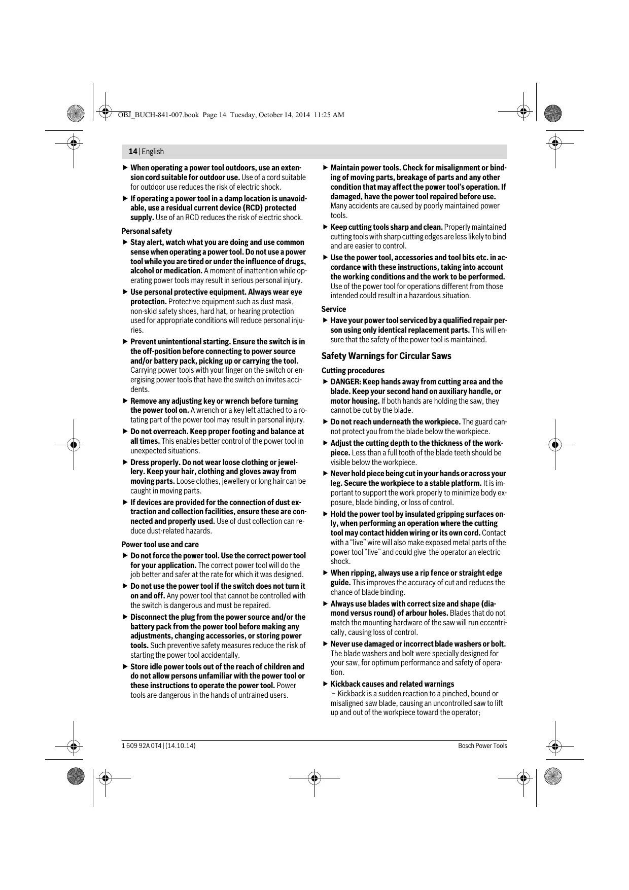 Bosch Power Tools 1 609 92A 0T4 | (14.10.14) OBJ_BUCH-841-007.book Page 6 Tuesday, October 14, 2014 11:25 AM 6 | Deutsch Bosch Power Tools OBJ_BUCH-841-007.book Page 7 Tuesday, October 14, 2014 11:25 AM Bosch Power Tools OBJ_BUCH-841-007.book Page 8 Tuesday, October 14, 2014 11:25 AM OBJ_BUCH-841-007.book Page 9 Tuesday, October 14, 2014 11:25 AM Bosch Power Tools OBJ_BUCH-841-007.book Page 10 Tuesday, October 14, 2014 11:25 AM OBJ_BUCH-841-007.book Page 11 Tuesday, October 14, 2014 11:25 AM OBJ_BUCH-841-007.book Page 12 Tuesday, October 14, 2014 11:25 AM Bosch Power Tools OBJ_BUCH-841-007.book Page 13 Tuesday, October 14, 2014 11:25 AM Bosch Power Tools English Safety Notes General Power Tool Safety Warnings Read all safety warnings and all instructions. Failure to follow the warnings and instructions may result in electric shock, fire and/or serious injury. Save all warnings and instructions for future reference. The term “power tool” in the warnings refers to your mainsoperated (corded) power tool or battery-operated (cordless) power tool. WARNING Work area safety Keep work area clean and well lit. Cluttered or dark areas invite accidents. Do not operate power tools in explosive atmospheres, such as in the presence of flammable liquids, gases or dust. Power tools create sparks which may ignite the dust or fumes. Keep children and bystanders away while operating a power tool. Distractions can cause you to lose control. Electrical safety Power tool plugs must match the outlet. Never modify the plug in any way. Do not use any adapter plugs with earthed (grounded) power tools. Unmodified plugs and matching outlets will reduce risk of electric shock. Avoid body contact with earthed or grounded surfaces, such as pipes, radiators, ranges and refrigerators. There is an increased risk of electric shock if your body is earthed or grounded. Do not expose power tools to rain or wet conditions. Water entering a power tool will increase the risk of electric shock. Do not abuse the cord. Never use the cord for carrying, pulling or unplugging the power tool. Keep cord away from heat, oil, sharp edges and moving parts. Damaged or entangled cords increase the risk of electric shock. 1 609 92A 0T4 | (14.10.14) OBJ_BUCH-841-007.book Page 14 Tuesday, October 14, 2014 11:25 AM 14 | English When operating a power tool outdoors, use an extension cord suitable for outdoor use. Use of a cord suitable for outdoor use reduces the risk of electric shock. If operating a power tool in a damp location is unavoidable, use a residual current device (RCD) protected supply. Use of an RCD reduces the risk of electric shock. Personal safety Stay alert, watch what you are doing and use common sense when operating a power tool. Do not use a power tool while you are tired or under the influence of drugs, alcohol or medication. A moment of inattention while operating power tools may result in serious personal injury. Use personal protective equipment. Always wear eye protection. Protective equipment such as dust mask, non-skid safety shoes, hard hat, or hearing protection used for appropriate conditions will reduce personal injuries. Prevent unintentional starting. Ensure the switch is in the off-position before connecting to power source and/or battery pack, picking up or carrying the tool. Carrying power tools with your finger on the switch or energising power tools that have the switch on invites accidents. Remove any adjusting key or wrench before turning the power tool on. A wrench or a key left attached to a rotating part of the power tool may result in personal injury. Do not overreach. Keep proper footing and balance at all times. This enables better control of the power tool in unexpected situations. Dress properly. Do not wear loose clothing or jewellery. Keep your hair, clothing and gloves away from moving parts. Loose clothes, jewellery or long hair can be caught in moving parts. If devices are provided for the connection of dust extraction and collection facilities, ensure these are connected and properly used. Use of dust collection can reduce dust-related hazards. Power tool use and care Do not force the power tool. Use the correct power tool for your application. The correct power tool will do the job better and safer at the rate for which it was designed. Do not use the power tool if the switch does not turn it on and off. Any power tool that cannot be controlled with the switch is dangerous and must be repaired. Disconnect the plug from the power source and/or the battery pack from the power tool before making any adjustments, changing accessories, or storing power tools. Such preventive safety measures reduce the risk of starting the power tool accidentally. Store idle power tools out of the reach of children and do not allow persons unfamiliar with the power tool or these instructions to operate the power tool. Power tools are dangerous in the hands of untrained users. 1 609 92A 0T4 | (14.10.14) Maintain power tools. Check for misalignment or binding of moving parts, breakage of parts and any other condition that may affect the power tool’s operation. If damaged, have the power tool repaired before use. Many accidents are caused by poorly maintained power tools. Keep cutting tools sharp and clean. Properly maintained cutting tools with sharp cutting edges are less likely to bind and are easier to control. Use the power tool, accessories and tool bits etc. in accordance with these instructions, taking into account the working conditions and the work to be performed. Use of the power tool for operations different from those intended could result in a hazardous situation. Service Have your power tool serviced by a qualified repair person using only identical replacement parts. This will ensure that the safety of the power tool is maintained. Safety Warnings for Circular Saws Cutting procedures