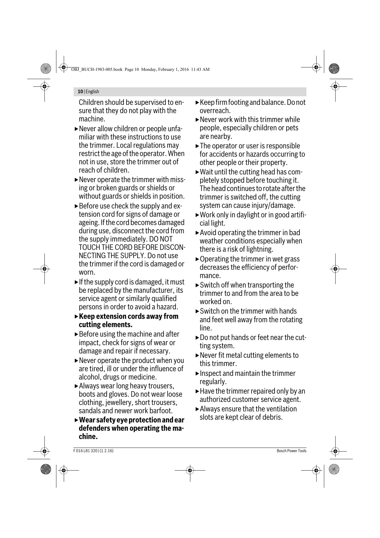 machine when operating. Operation This machine is not intended for use by persons (including children) with reduced physical, sensory or mental capabilities, or lack of experience and knowledge, unless they have been given supervision or instruction concerning use of the machine by a person responsible for their safety. F 016 L81 320 | (1.2.16) OBJ_BUCH-1983-005.book Page 10 Monday, February 1, 2016 11:43 AM 10 | English Children should be supervised to ensure that they do not play with the machine. Never allow children or people unfamiliar with these instructions to use the trimmer. Local regulations may restrict the age of the operator. When not in use, store the trimmer out of reach of children. Never operate the trimmer with missing or broken guards or shields or without guards or shields in position. Before use check the supply and extension cord for signs of damage or ageing. If the cord becomes damaged during use, disconnect the cord from the supply immediately. DO NOT TOUCH THE CORD BEFORE DISCONNECTING THE SUPPLY. Do not use the trimmer if the cord is damaged or worn. If the supply cord is damaged, it must be replaced by the manufacturer, its service agent or similarly qualified persons in order to avoid a hazard. Keep extension cords away from cutting elements. Before using the machine and after impact, check for signs of wear or damage and repair if necessary. Never operate the product when you are tired, ill or under the influence of alcohol, drugs or medicine. Always wear long heavy trousers, boots and gloves. Do not wear loose clothing, jewellery, short trousers, sandals and newer work barfoot. Wear safety eye protection and ear defenders when operating the machine. F 016 L81 320 | (1.2.16) Keep firm footing and balance. Do not overreach. Never work with this trimmer while people, especially children or pets are nearby. The operator or user is responsible for accidents or hazards occurring to other people or their property. Wait until the cutting head has completely stopped before touching it. The head continues to rotate after the trimmer is switched off, the cutting system can cause injury/damage. Work only in daylight or in good artificial light. Avoid operating the trimmer in bad weather conditions especially when there is a risk of lightning. Operating the trimmer in wet grass decreases the efficiency of performance. Switch off when transporting the trimmer to and from the area to be worked on. Switch on the trimmer with hands and feet well away from the rotating line. Do not put hands or feet near the cutting system. Never fit metal cutting elements to this trimmer. Inspect and maintain the trimmer regularly. Have the trimmer repaired only by an authorized customer service agent. Always ensure that the ventilation slots are kept clear of debris. Bosch Power Tools OBJ_BUCH-1983-005.book Page 11 Monday, February 1, 2016 11:43 AM English | 11 Take care against injury from the blade fitted for cutting the nylon line length. After feeding line always return the trimmer to its horizontal operating position before switching on. Switch off and remove the plug from the socket: – whenever you leave the machine unattended for any period – before replacing the spool – before cleaning or working on the trimmer After use, disconnect the machine from the mains and check for damage. Store the machine in a secure, dry place out of the reach of children. Do not place other objects on top of the machine. Replace worn or damaged parts for safety. Ensure replacement parts fitted are Bosch approved. Do not operate the machine without the trimmer attachment fitted. Electrical Safety Warning! Switch off, remove plug from mains before adjusting, cleaning or if cable is cut, damaged or entangled. The cutting line continues to rotate for a few seconds after the trimmer is switched off. Caution – do not touch rotating cutting line. Your machine is double insulated for safety and requires no earth connection. The operating voltage is 230 V AC, 50 Hz (for non-EU countries 220 V, Bosch Power Tools 240 V as applicable). Only use approved extension cables. Contact your Bosch Service Centre for details. It is recommended for increased electrical safety to use a Residual Current Device (RCD) with a tripping current of not more than 30 mA. Always check your RCD every time you use it. For products not sold in GB: