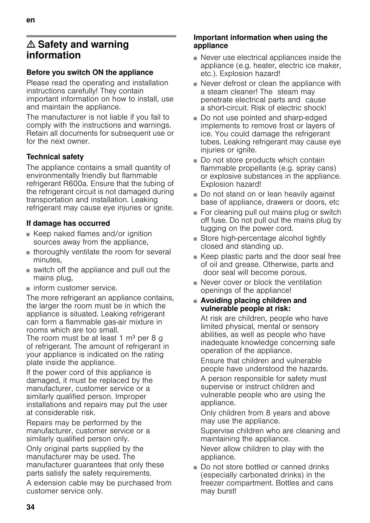 m Safety and warning information Before you switch ON the appliance Please read the operating and installation instructions carefully! They contain important information on how to install, use and maintain the appliance. The manufacturer is not liable if you fail to comply with the instructions and warnings. Retain all documents for subsequent use or for the next owner. Technical safety The appliance contains a small quantity of environmentally friendly but flammable refrigerant R600a. Ensure that the tubing of the refrigerant circuit is not damaged during transportation and installation. Leaking refrigerant may cause eye injuries or ignite. If damage has occurred ■ Keep naked flames and/or ignition sources away from the appliance, ■ thoroughly ventilate the room for several minutes, ■ switch off the appliance and pull out the mains plug, ■ inform customer service. The more refrigerant an appliance contains, the larger the room must be in which the appliance is situated. Leaking refrigerant can form a flammable gas-air mixture in rooms which are too small. The room must be at least 1 m³ per 8 g of refrigerant. The amount of refrigerant in your appliance is indicated on the rating plate inside the appliance. If the power cord of this appliance is damaged, it must be replaced by the manufacturer, customer service or a similarly qualified person. Improper installations and repairs may put the user at considerable risk. Repairs may be performed by the manufacturer, customer service or a similarly qualified person only. Only original parts supplied by the manufacturer may be used. The manufacturer guarantees that only these parts satisfy the safety requirements. A extension cable may be purchased from customer service only.