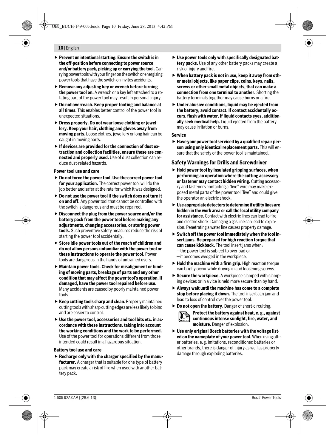 1 609 92A 0AM | (28.6.13) OBJ_BUCH-149-005.book Page 4 Friday, June 28, 2013 4:42 PM 4 | Deutsch OBJ_BUCH-149-005.book Page 5 Friday, June 28, 2013 4:42 PM OBJ_BUCH-149-005.book Page 6 Friday, June 28, 2013 4:42 PM Bosch Power Tools OBJ_BUCH-149-005.book Page 7 Friday, June 28, 2013 4:42 PM Deutsch | 7 Konformitätserklärung Bohrfutter wechseln Bosch Power Tools OBJ_BUCH-149-005.book Page 8 Friday, June 28, 2013 4:42 PM Bosch Power Tools OBJ_BUCH-149-005.book Page 9 Friday, June 28, 2013 4:42 PM English Safety Notes General Power Tool Safety Warnings Read all safety warnings and all instructions. Failure to follow the warnings and instructions may result in electric shock, fire and/or serious injury. Save all warnings and instructions for future reference. The term “power tool” in the warnings refers to your mainsoperated (corded) power tool or battery-operated (cordless) power tool. WARNING Work area safety Keep work area clean and well lit. Cluttered or dark areas invite accidents. Do not operate power tools in explosive atmospheres, such as in the presence of flammable liquids, gases or dust. Power tools create sparks which may ignite the dust or fumes. Keep children and bystanders away while operating a power tool. Distractions can cause you to lose control. Electrical safety Power tool plugs must match the outlet. Never modify the plug in any way. Do not use any adapter plugs with earthed (grounded) power tools. Unmodified plugs and matching outlets will reduce risk of electric shock. Avoid body contact with earthed or grounded surfaces, such as pipes, radiators, ranges and refrigerators. There is an increased risk of electric shock if your body is earthed or grounded. Do not expose power tools to rain or wet conditions. Water entering a power tool will increase the risk of electric shock. Do not abuse the cord. Never use the cord for carrying, pulling or unplugging the power tool. Keep cord away from heat, oil, sharp edges and moving parts. Damaged or entangled cords increase the risk of electric shock. When operating a power tool outdoors, use an extension cord suitable for outdoor use. Use of a cord suitable for outdoor use reduces the risk of electric shock. If operating a power tool in a damp location is unavoidable, use a residual current device (RCD) protected supply. Use of an RCD reduces the risk of electric shock. Personal safety Stay alert, watch what you are doing and use common sense when operating a power tool. Do not use a power tool while you are tired or under the influence of drugs, alcohol or medication. A moment of inattention while operating power tools may result in serious personal injury. Use personal protective equipment. Always wear eye protection. Protective equipment such as dust mask, non-skid safety shoes, hard hat, or hearing protection used for appropriate conditions will reduce personal injuries. Bosch Power Tools 1 609 92A 0AM | (28.6.13) OBJ_BUCH-149-005.book Page 10 Friday, June 28, 2013 4:42 PM 10 | English Prevent unintentional starting. Ensure the switch is in the off-position before connecting to power source and/or battery pack, picking up or carrying the tool. Carrying power tools with your finger on the switch or energising power tools that have the switch on invites accidents. Remove any adjusting key or wrench before turning the power tool on. A wrench or a key left attached to a rotating part of the power tool may result in personal injury. Do not overreach. Keep proper footing and balance at all times. This enables better control of the power tool in unexpected situations. Dress properly. Do not wear loose clothing or jewellery. Keep your hair, clothing and gloves away from moving parts. Loose clothes, jewellery or long hair can be caught in moving parts. If devices are provided for the connection of dust extraction and collection facilities, ensure these are connected and properly used. Use of dust collection can reduce dust-related hazards. Power tool use and care Do not force the power tool. Use the correct power tool for your application. The correct power tool will do the job better and safer at the rate for which it was designed. Do not use the power tool if the switch does not turn it on and off. Any power tool that cannot be controlled with the switch is dangerous and must be repaired. Disconnect the plug from the power source and/or the battery pack from the power tool before making any adjustments, changing accessories, or storing power tools. Such preventive safety measures reduce the risk of starting the power tool accidentally. Store idle power tools out of the reach of children and do not allow persons unfamiliar with the power tool or these instructions to operate the power tool. Power tools are dangerous in the hands of untrained users. Maintain power tools. Check for misalignment or binding of moving parts, breakage of parts and any other condition that may affect the power tool’s operation. If damaged, have the power tool repaired before use. Many accidents are caused by poorly maintained power tools. Keep cutting tools sharp and clean. Properly maintained cutting tools with sharp cutting edges are less likely to bind and are easier to control. Use the power tool, accessories and tool bits etc. in accordance with these instructions, taking into account the working conditions and the work to be performed. Use of the power tool for operations different from those intended could result in a hazardous situation. Battery tool use and care Recharge only with the charger specified by the manufacturer. A charger that is suitable for one type of battery pack may create a risk of fire when used with another battery pack. 1 609 92A 0AM | (28.6.13) Use power tools only with specifically designated battery packs. Use of any other battery packs may create a risk of injury and fire. When battery pack is not in use, keep it away from other metal objects, like paper clips, coins, keys, nails, screws or other small metal objects,